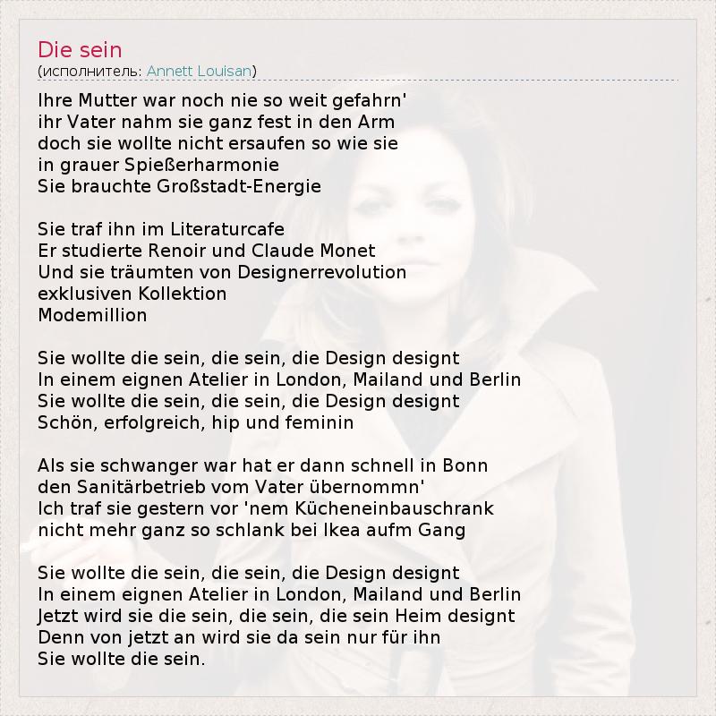Это интересно:Annett Louisan (настоящее имя Annett Page) - немецкая певица, родилась 2 апреля 1979 года в Германии. Долгое время прожила с семьей в Гамбурге. Louisan - сценический псевдоним, который она преобразовала из имени своей бабушки Луизы. В 2004 году вышла замуж за Gazi Isikatli, турецкого студента. Ее первый альбом "Boheme" занял третье место в немецкий чартах.