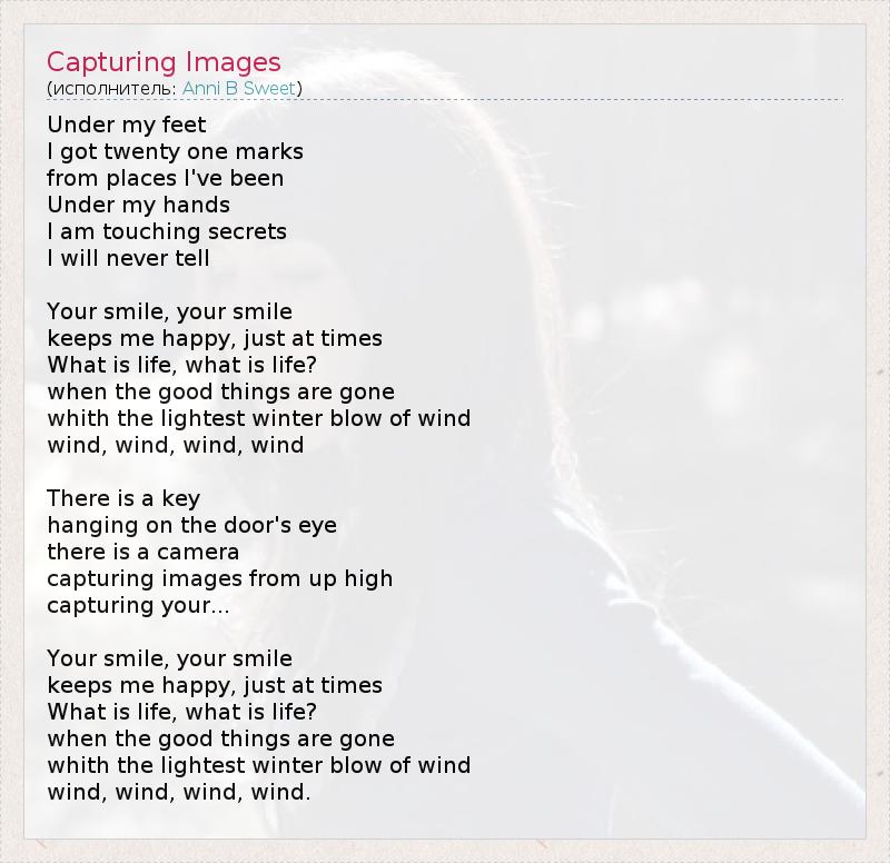 Under my feet I got twenty one marks from places I've been Under my hands I am touching secrets I will never tell Your smile, your smile keeps me happy, just at times What is life, what is life? when the good things are gone whith the lightest winter blow of wind wind, wind, wind, wind There is a key hanging on the door's eye there is a camera capturing images from up high capturing your... Your smile, your smile keeps me happy, just at times What is life, what is life? when the good things are gone whith the lightest winter blow of wind wind, wind, wind, wind.