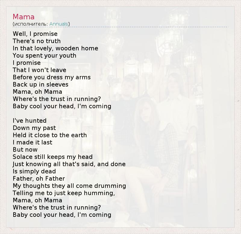 Well, I promise There's no truth In that lovely, wooden home You spent your youth I promise That I won't leave Before you dress my arms Back up in sleeves Mama, oh Mama Where's the trust in running? Baby cool your head, I'm coming I've hunted Down my past Held it close to the earth I made it last But now Solace still keeps my head Just knowing all that's said, and done Is simply dead Father, oh Father My thoughts they all come drumming Telling me to just keep humming, Mama, oh Mama Where's the trust in running? Baby cool your head, I'm coming