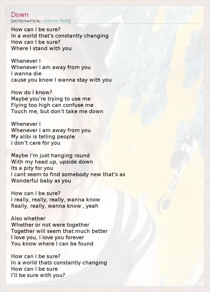 Как я могу быть уверена? В мире, который постоянно меняется, Как я могу быть уверена? Я стою с тобой. Когда я Когда я далеко от тебя, Я хочу умереть, Ведь ты знаешь, что я хочу быть с тобой. Как я могу знать? Может, ты пытаешься воспользоваться мной, Я боюсь летать слишком высоко, Коснись меня, но не бросай меня. Когда я Когда я далеко от тебя, О моем алиби скажут люди, Мне все равно на тебя. Может, я всего лишь хожу здесь, С поднятой головой, Жаль тебя, Мне кажется, я не найду кого-то другого Такого замечательного, как ты. Как ты можешь быть уверен? Я действительно хочу знать, Действительно хочу знать, да. И тогда, Когда мы не вместе, Вместе всегда лучше, Я люблю тебя, я люблю тебя навсегда. Ты знаешь, где меня найти. Как я могу быть уверена? В мире, который постоянно меняется, Как я могу быть уверена, Как я могу быть уверена в тебе?