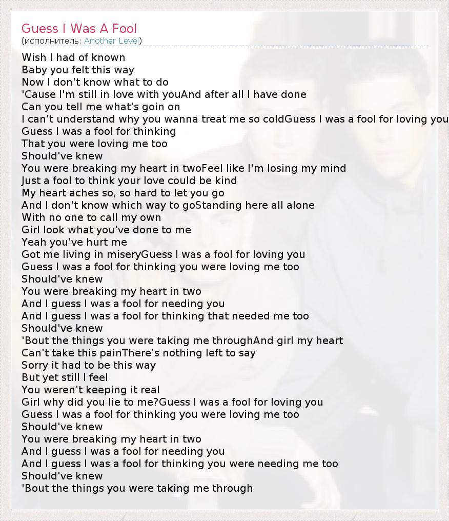 Wish I had of known Baby you felt this way Now I don't know what to do 'Cause I'm still in love with youAnd after all I have done Can you tell me what's goin on I can't understand why you wanna treat me so coldGuess I was a fool for loving you Guess I was a fool for thinking That you were loving me too Should've knew You were breaking my heart in twoFeel like I'm losing my mind Just a fool to think your love could be kind My heart aches so, so hard to let you go And I don't know which way to goStanding here all alone With no one to call my own Girl look what you've done to me Yeah you've hurt me Got me living in miseryGuess I was a fool for loving you Guess I was a fool for thinking you were loving me too Should've knew You were breaking my heart in two And I guess I was a fool for needing you And I guess I was a fool for thinking that needed me too Should've knew 'Bout the things you were taking me throughAnd girl my heart Can't take this painThere's nothing left to say Sorry it had to be this way But yet still I feel You weren't keeping it real Girl why did you lie to me?Guess I was a fool for loving you Guess I was a fool for thinking you were loving me too Should've knew You were breaking my heart in two And I guess I was a fool for needing you And I guess I was a fool for thinking you were needing me too Should've knew 'Bout the things you were taking me through