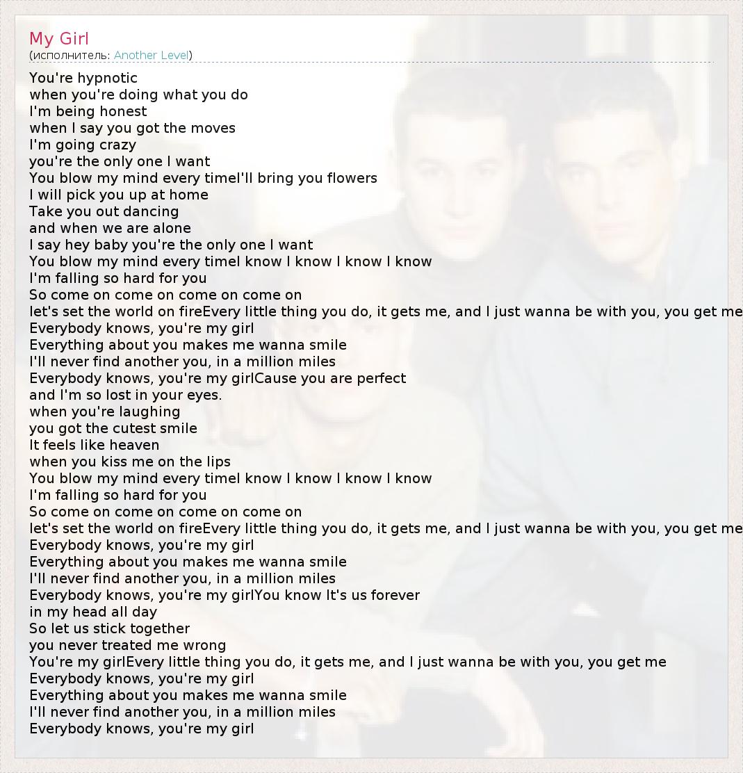 You're hypnotic when you're doing what you do I'm being honest when I say you got the moves I'm going crazy you're the only one I want You blow my mind every timeI'll bring you flowers I will pick you up at home Take you out dancing and when we are alone I say hey baby you're the only one I want You blow my mind every timeI know I know I know I know I'm falling so hard for you So come on come on come on come on let's set the world on fireEvery little thing you do, it gets me, and I just wanna be with you, you get me Everybody knows, you're my girl Everything about you makes me wanna smile I'll never find another you, in a million miles Everybody knows, you're my girlCause you are perfect and I'm so lost in your eyes. when you're laughing you got the cutest smile It feels like heaven when you kiss me on the lips You blow my mind every timeI know I know I know I know I'm falling so hard for you So come on come on come on come on let's set the world on fireEvery little thing you do, it gets me, and I just wanna be with you, you get me Everybody knows, you're my girl Everything about you makes me wanna smile I'll never find another you, in a million miles Everybody knows, you're my girlYou know It's us forever in my head all day So let us stick together you never treated me wrong You're my girlEvery little thing you do, it gets me, and I just wanna be with you, you get me Everybody knows, you're my girl Everything about you makes me wanna smile I'll never find another you, in a million miles Everybody knows, you're my girl