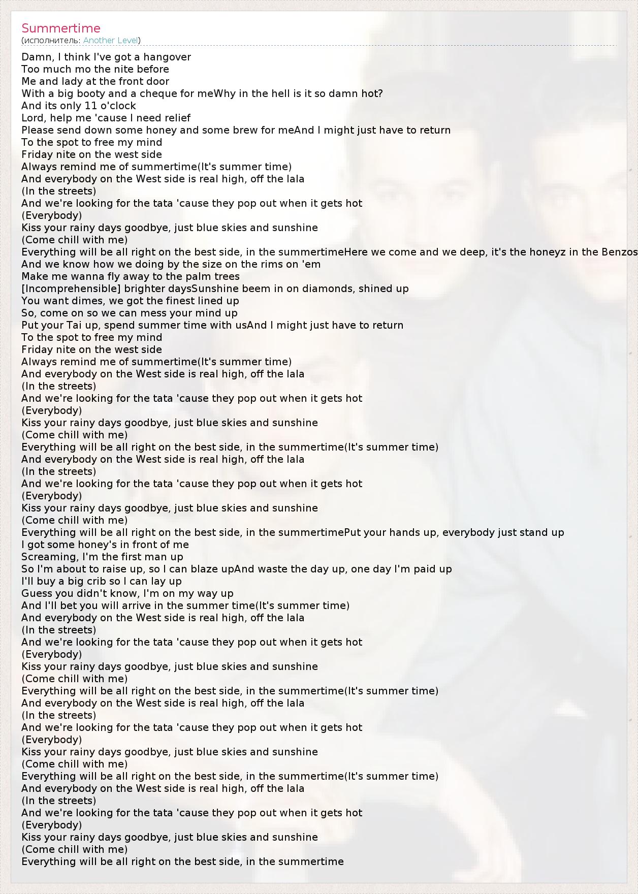 Damn, I think I've got a hangover Too much mo the nite before Me and lady at the front door With a big booty and a cheque for meWhy in the hell is it so damn hot? And its only 11 o'clock Lord, help me 'cause I need relief Please send down some honey and some brew for meAnd I might just have to return To the spot to free my mind Friday nite on the west side Always remind me of summertime(It's summer time) And everybody on the West side is real high, off the lala (In the streets) And we're looking for the tata 'cause they pop out when it gets hot (Everybody) Kiss your rainy days goodbye, just blue skies and sunshine (Come chill with me) Everything will be all right on the best side, in the summertimeHere we come and we deep, it's the honeyz in the Benzos And we know how we doing by the size on the rims on 'em Make me wanna fly away to the palm trees [Incomprehensible] brighter daysSunshine beem in on diamonds, shined up You want dimes, we got the finest lined up So, come on so we can mess your mind up Put your Tai up, spend summer time with usAnd I might just have to return To the spot to free my mind Friday nite on the west side Always remind me of summertime(It's summer time) And everybody on the West side is real high, off the lala (In the streets) And we're looking for the tata 'cause they pop out when it gets hot (Everybody) Kiss your rainy days goodbye, just blue skies and sunshine (Come chill with me) Everything will be all right on the best side, in the summertime(It's summer time) And everybody on the West side is real high, off the lala (In the streets) And we're looking for the tata 'cause they pop out when it gets hot (Everybody) Kiss your rainy days goodbye, just blue skies and sunshine (Come chill with me) Everything will be all right on the best side, in the summertimePut your hands up, everybody just stand up I got some honey's in front of me Screaming, I'm the first man up So I'm about to raise up, so I can blaze upAnd waste the day up, one day I'm paid up I'll buy a big crib so I can lay up Guess you didn't know, I'm on my way up And I'll bet you will arrive in the summer time(It's summer time) And everybody on the West side is real high, off the lala (In the streets) And we're looking for the tata 'cause they pop out when it gets hot (Everybody) Kiss your rainy days goodbye, just blue skies and sunshine (Come chill with me) Everything will be all right on the best side, in the summertime(It's summer time) And everybody on the West side is real high, off the lala (In the streets) And we're looking for the tata 'cause they pop out when it gets hot (Everybody) Kiss your rainy days goodbye, just blue skies and sunshine (Come chill with me) Everything will be all right on the best side, in the summertime(It's summer time) And everybody on the West side is real high, off the lala (In the streets) And we're looking for the tata 'cause they pop out when it gets hot (Everybody) Kiss your rainy days goodbye, just blue skies and sunshine (Come chill with me) Everything will be all right on the best side, in the summertime
