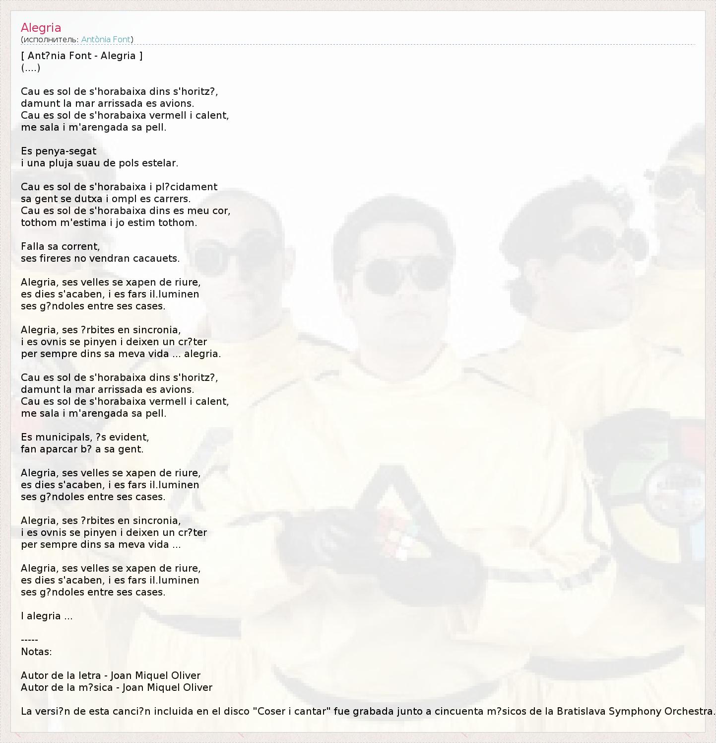 Это интересно:Группа Antònia Font была образована в 1997 году на о. Мальорка. Для музыки группы характерны мажорный тон и фантастические тексты на catala de Baleares – том варианте каталанского языка, на котором говорят на Балераских островах. Обычные для группы темы: астрономия, астронавтика, робототехника, море… Темы, несколько отличающиеся в большистве своём от тем других групп. Часто в композициях Antònia Font... продолжение
