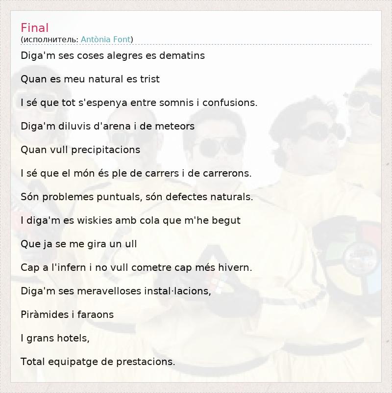 Это интересно:Группа Antònia Font была образована в 1997 году на о. Мальорка. Для музыки группы характерны мажорный тон и фантастические тексты на catala de Baleares – том варианте каталанского языка, на котором говорят на Балераских островах. Обычные для группы темы: астрономия, астронавтика, робототехника, море… Темы, несколько отличающиеся в большистве своём от тем других групп. Часто в композициях Antònia Font... продолжение