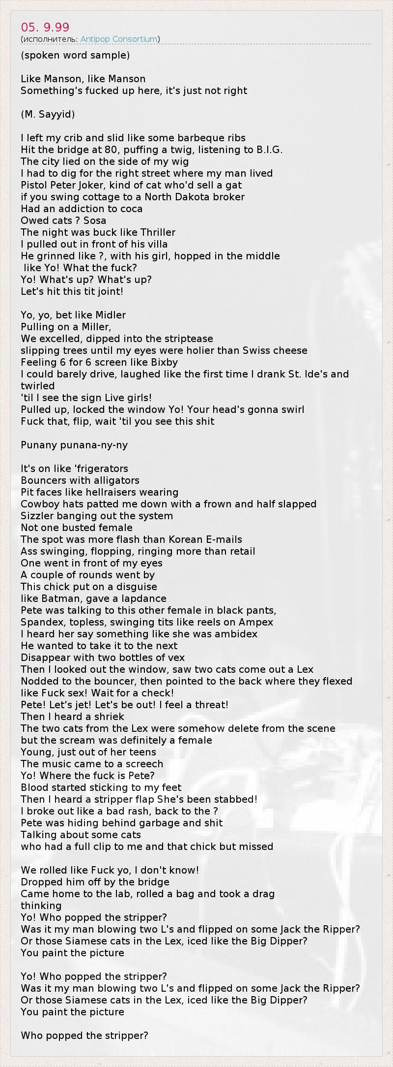 (spoken word sample) Like Manson, like Manson Something's fucked up here, it's just not right (M. Sayyid) I left my crib and slid like some barbeque ribs Hit the bridge at 80, puffing a twig, listening to B.I.G. The city lied on the side of my wig I had to dig for the right street where my man lived Pistol Peter Joker, kind of cat who'd sell a gat if you swing cottage to a North Dakota broker Had an addiction to coca Owed cats ? Sosa The night was buck like Thriller I pulled out in front of his villa He grinned like ?, with his girl, hopped in the middle like Yo! What the fuck? Yo! What's up? What's up? Let's hit this tit joint! Yo, yo, bet like Midler Pulling on a Miller, We excelled, dipped into the striptease slipping trees until my eyes were holier than Swiss cheese Feeling 6 for 6 screen like Bixby I could barely drive, laughed like the first time I drank St. Ide's and twirled 'til I see the sign Live girls! Pulled up, locked the window Yo! Your head's gonna swirl Fuck that, flip, wait 'til you see this shit Punany punana-ny-ny It's on like 'frigerators Bouncers with alligators Pit faces like hellraisers wearing Cowboy hats patted me down with a frown and half slapped Sizzler banging out the system Not one busted female The spot was more flash than Korean E-mails Ass swinging, flopping, ringing more than retail One went in front of my eyes A couple of rounds went by This chick put on a disguise like Batman, gave a lapdance Pete was talking to this other female in black pants, Spandex, topless, swinging tits like reels on Ampex I heard her say something like she was ambidex He wanted to take it to the next Disappear with two bottles of vex Then I looked out the window, saw two cats come out a Lex Nodded to the bouncer, then pointed to the back where they flexed like Fuck sex! Wait for a check! Pete! Let's jet! Let's be out! I feel a threat! Then I heard a shriek The two cats from the Lex were somehow delete from the scene but the scream was definitely a female Young, just out of her teens The music came to a screech Yo! Where the fuck is Pete? Blood started sticking to my feet Then I heard a stripper flap She's been stabbed! I broke out like a bad rash, back to the ? Pete was hiding behind garbage and shit Talking about some cats who had a full clip to me and that chick but missed We rolled like Fuck yo, I don't know! Dropped him off by the bridge Came home to the lab, rolled a bag and took a drag thinking Yo! Who popped the stripper? Was it my man blowing two L's and flipped on some Jack the Ripper? Or those Siamese cats in the Lex, iced like the Big Dipper? You paint the picture Yo! Who popped the stripper? Was it my man blowing two L's and flipped on some Jack the Ripper? Or those Siamese cats in the Lex, iced like the Big Dipper? You paint the picture Who popped the stripper?