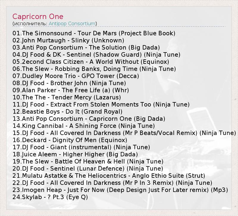 01.The Simonsound - Tour De Mars (Project Blue Book) 02.John Murtaugh - Slinky (Unknown) 03.Anti Pop Consortium - The Solution (Big Dada) 04.DJ Food & DK - Sentinel (Shadow Guard) (Ninja Tune) 05.2econd Class Citizen - A World Without (Equinox) 06.The Slew - Robbing Banks, Doing Time (Ninja Tune) 07.Dudley Moore Trio - GPO Tower (Decca) 08.DJ Food - Brother John (Ninja Tune) 09.Alan Parker - The Free Life (a) (Whr) 10.The The - Tender Mercy (Lazarus) 11.DJ Food - Extract From Stolen Moments Too (Ninja Tune) 12.Beastie Boys - Do It (Grand Royal) 13.Anti Pop Consortium - Capricorn One (Big Dada) 14.King Cannibal - A Shining Force (Ninja Tune) 15.DJ Food - All Covered In Darkness (Mr P Beats/Vocal Remix) (Ninja Tune) 16.Deckard - Dignity Of Men (Equinox) 17.DJ Food - Giant (instrumental) (Ninja Tune) 18.Juice Aleem - Higher Higher (Big Dada) 19.The Slew - Battle Of Heaven & Hell (Ninja Tune) 20.DJ Food - Sentinel (Lunar Defence) (Ninja Tune) 21.Mulatu Astatke & The Heliocentrics - Anglo Ethio Suite (Strut) 22.DJ Food - All Covered In Darkness (Mr P In 3 Remix) (Ninja Tune) 23.Imogen Heap - Just For Now (Deep Design Just For Later remix) (Mp3) 24.Skylab - ? Pt.3 (Eye Q)
