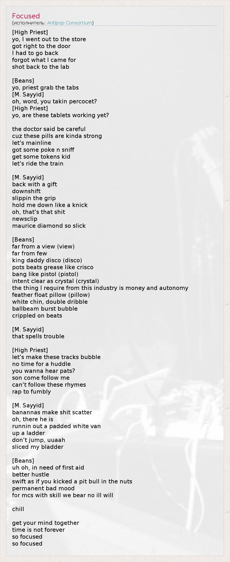 [High Priest] yo, I went out to the store got right to the door I had to go back forgot what I came for shot back to the lab [Beans] yo, priest grab the tabs [M. Sayyid] oh, word, you takin percocet? [High Priest] yo, are these tablets working yet? the doctor said be careful cuz these pills are kinda strong let's mainline got some poke n sniff get some tokens kid let's ride the train [M. Sayyid] back with a gift downshift slippin the grip hold me down like a knick oh, that's that shit newsclip maurice diamond so slick [Beans] far from a view (view) far from few king daddy disco (disco) pots beats grease like crisco bang like pistol (pistol) intent clear as crystal (crystal) the thing I require from this industry is money and autonomy feather float pillow (pillow) white chin, double dribble ballbeam burst bubble crippled on beats [M. Sayyid] that spells trouble [High Priest] let's make these tracks bubble no time for a huddle you wanna hear pats? son come follow me can't follow these rhymes rap to fumbly [M. Sayyid] banannas make shit scatter oh, there he is runnin out a padded white van up a ladder don't jump, uuaah sliced my bladder [Beans] uh oh, in need of first aid better hustle swift as if you kicked a pit bull in the nuts permanent bad mood for mcs with skill we bear no ill will chill get your mind together time is not forever so focused so focused