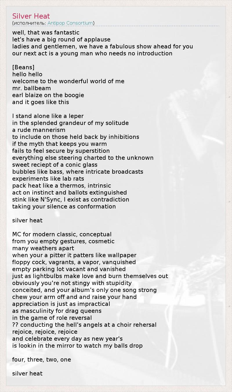 well, that was fantastic let's have a big round of applause ladies and gentlemen, we have a fabulous show ahead for you our next act is a young man who needs no introduction [Beans] hello hello welcome to the wonderful world of me mr. ballbeam earl blaize on the boogie and it goes like this I stand alone like a leper in the splended grandeur of my solitude a rude mannerism to include on those held back by inhibitions if the myth that keeps you warm fails to feel secure by superstition everything else steering charted to the unknown sweet reciept of a conic glass bubbles like bass, where intricate broadcasts experiments like lab rats pack heat like a thermos, intrinsic act on instinct and ballots extinguished stink like N'Sync, I exist as contradiction taking your silence as conformation silver heat MC for modern classic, conceptual from you empty gestures, cosmetic many weathers apart when your a pitter it patters like wallpaper floppy cock, vagrants, a vapor, vanquished empty parking lot vacant and vanished just as lightbulbs make love and burn themselves out obviously you're not stingy with stupidity conceited, and your album's only one song strong chew your arm off and and raise your hand appreciation is just as impractical as masculinity for drag queens in the game of role reversal ?? conducting the hell's angels at a choir rehersal rejoice, rejoice, rejoice and celebrate every day as new year's is lookin in the mirror to watch my balls drop four, three, two, one silver heat