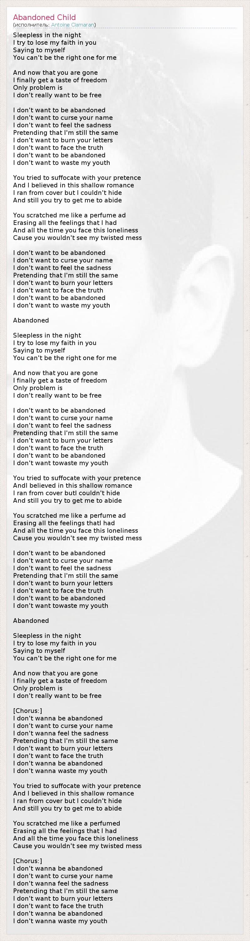 Sleepless in the night I try to lose my faith in you Saying to myself You can't be the right one for me And now that you are gone I finally get a taste of freedom Only problem is I don't really want to be free I don't want to be abandoned I don't want to curse your name I don't want to feel the sadness Pretending that I'm still the same I don't want to burn your letters I don't want to face the truth I don't want to be abandoned I don't want to waste my youth You tried to suffocate with your pretence And I believed in this shallow romance I ran from cover but I couldn't hide And still you try to get me to abide You scratched me like a perfume ad Erasing all the feelings that I had And all the time you face this loneliness Cause you wouldn't see my twisted mess I don't want to be abandoned I don't want to curse your name I don't want to feel the sadness Pretending that I'm still the same I don't want to burn your letters I don't want to face the truth I don't want to be abandoned I don't want to waste my youth Abandoned Sleepless in the night I try to lose my faith in you Saying to myself You can't be the right one for me And now that you are gone I finally get a taste of freedom Only problem is I don't really want to be free I don't want to be abandoned I don't want to curse your name I don't want to feel the sadness Pretending that I'm still the same I don't want to burn your letters I don't want to face the truth I don't want to be abandoned I don't want towaste my youth You tried to suffocate with your pretence AndI believed in this shallow romance I ran from cover butI couldn't hide And still you try to get me to abide You scratched me like a perfume ad Erasing all the feelings thatI had And all the time you face this loneliness Cause you wouldn't see my twisted mess I don't want to be abandoned I don't want to curse your name I don't want to feel the sadness Pretending that I'm still the same I don't want to burn your letters I don't want to face the truth I don't want to be abandoned I don't want towaste my youth Abandoned Sleepless in the night I try to lose my faith in you Saying to myself You can't be the right one for me And now that you are gone I finally get a taste of freedom Only problem is I don't really want to be free [Chorus:] I don't wanna be abandoned I don't want to curse your name I don't wanna feel the sadness Pretending that I'm still the same I don't want to burn your letters I don't want to face the truth I don't wanna be abandoned I don't wanna waste my youth You tried to suffocate with your pretence And I believed in this shallow romance I ran from cover but I couldn't hide And still you try to get me to abide You scratched me like a perfumed Erasing all the feelings that I had And all the time you face this loneliness Сause you wouldn't see my twisted mess [Chorus:] I don't wanna be abandoned I don't want to curse your name I don't wanna feel the sadness Pretending that I'm still the same I don't want to burn your letters I don't want to face the truth I don't wanna be abandoned I don't wanna waste my youth