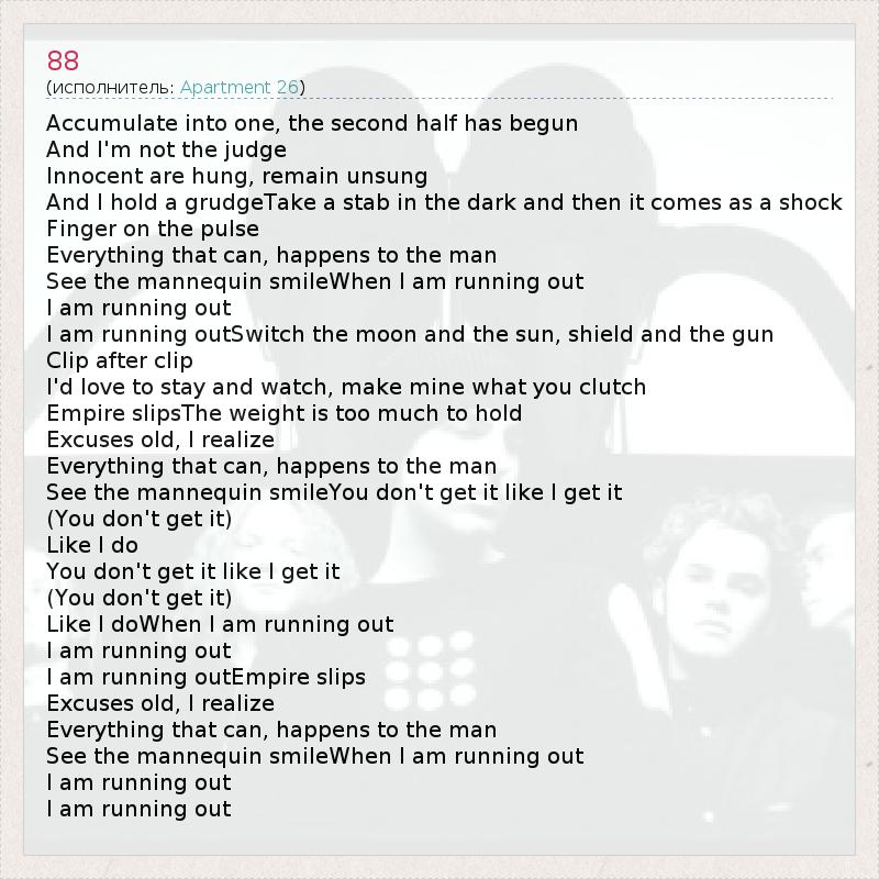 Accumulate into one, the second half has begun And I'm not the judge Innocent are hung, remain unsung And I hold a grudgeTake a stab in the dark and then it comes as a shock Finger on the pulse Everything that can, happens to the man See the mannequin smileWhen I am running out I am running out I am running outSwitch the moon and the sun, shield and the gun Clip after clip I'd love to stay and watch, make mine what you clutch Empire slipsThe weight is too much to hold Excuses old, I realize Everything that can, happens to the man See the mannequin smileYou don't get it like I get it (You don't get it) Like I do You don't get it like I get it (You don't get it) Like I doWhen I am running out I am running out I am running outEmpire slips Excuses old, I realize Everything that can, happens to the man See the mannequin smileWhen I am running out I am running out I am running out