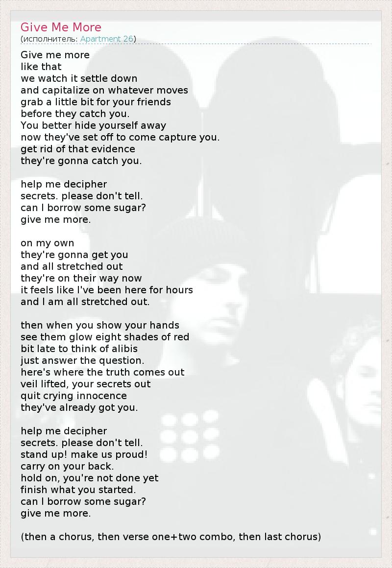 Give me more like that we watch it settle down and capitalize on whatever moves grab a little bit for your friends before they catch you. You better hide yourself away now they've set off to come capture you. get rid of that evidence they're gonna catch you. help me decipher secrets. please don't tell. can I borrow some sugar? give me more. on my own they're gonna get you and all stretched out they're on their way now it feels like I've been here for hours and I am all stretched out. then when you show your hands see them glow eight shades of red bit late to think of alibis just answer the question. here's where the truth comes out veil lifted, your secrets out quit crying innocence they've already got you. help me decipher secrets. please don't tell. stand up! make us proud! carry on your back. hold on, you're not done yet finish what you started. can I borrow some sugar? give me more. (then a chorus, then verse one+two combo, then last chorus)