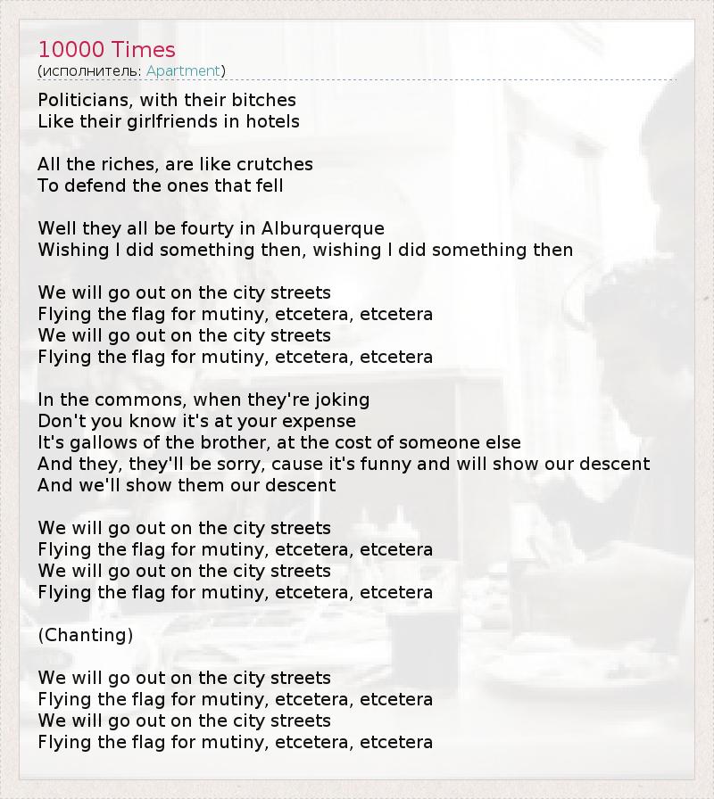 Politicians, with their bitches Like their girlfriends in hotels All the riches, are like crutches To defend the ones that fell Well they all be fourty in Alburquerque Wishing I did something then, wishing I did something then We will go out on the city streets Flying the flag for mutiny, etcetera, etcetera We will go out on the city streets Flying the flag for mutiny, etcetera, etcetera In the commons, when they're joking Don't you know it's at your expense It's gallows of the brother, at the cost of someone else And they, they'll be sorry, cause it's funny and will show our descent And we'll show them our descent We will go out on the city streets Flying the flag for mutiny, etcetera, etcetera We will go out on the city streets Flying the flag for mutiny, etcetera, etcetera (Chanting) We will go out on the city streets Flying the flag for mutiny, etcetera, etcetera We will go out on the city streets Flying the flag for mutiny, etcetera, etcetera