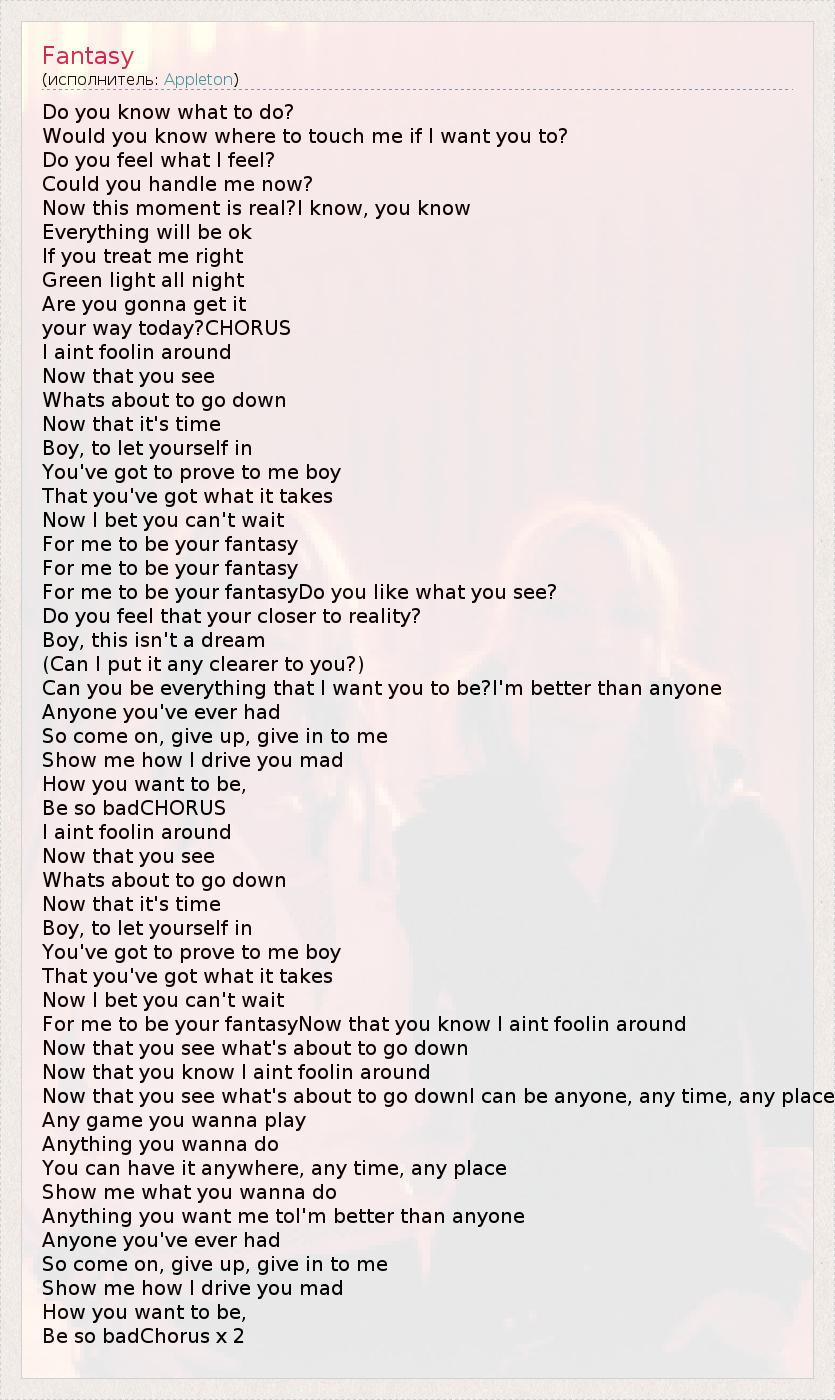 Do you know what to do? Would you know where to touch me if I want you to? Do you feel what I feel? Could you handle me now? Now this moment is real?I know, you know Everything will be ok If you treat me right Green light all night Are you gonna get it your way today?CHORUS I aint foolin around Now that you see Whats about to go down Now that it's time Boy, to let yourself in You've got to prove to me boy That you've got what it takes Now I bet you can't wait For me to be your fantasy For me to be your fantasy For me to be your fantasyDo you like what you see? Do you feel that your closer to reality? Boy, this isn't a dream (Can I put it any clearer to you?) Can you be everything that I want you to be?I'm better than anyone Anyone you've ever had So come on, give up, give in to me Show me how I drive you mad How you want to be, Be so badCHORUS I aint foolin around Now that you see Whats about to go down Now that it's time Boy, to let yourself in You've got to prove to me boy That you've got what it takes Now I bet you can't wait For me to be your fantasyNow that you know I aint foolin around Now that you see what's about to go down Now that you know I aint foolin around Now that you see what's about to go downI can be anyone, any time, any place Any game you wanna play Anything you wanna do You can have it anywhere, any time, any place Show me what you wanna do Anything you want me toI'm better than anyone Anyone you've ever had So come on, give up, give in to me Show me how I drive you mad How you want to be, Be so badChorus x 2