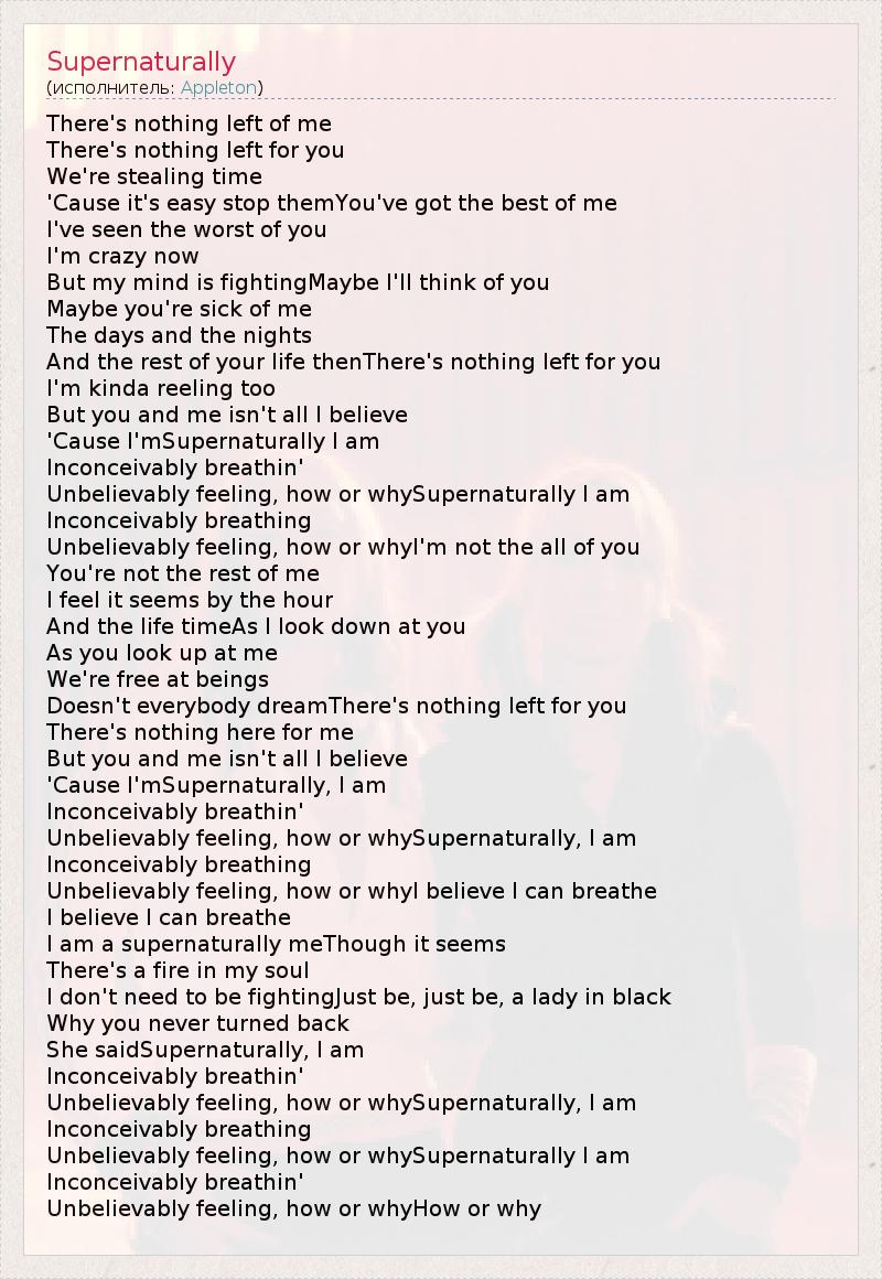 There's nothing left of me There's nothing left for you We're stealing time 'Cause it's easy stop themYou've got the best of me I've seen the worst of you I'm crazy now But my mind is fightingMaybe I'll think of you Maybe you're sick of me The days and the nights And the rest of your life thenThere's nothing left for you I'm kinda reeling too But you and me isn't all I believe 'Cause I'mSupernaturally I am Inconceivably breathin' Unbelievably feeling, how or whySupernaturally I am Inconceivably breathing Unbelievably feeling, how or whyI'm not the all of you You're not the rest of me I feel it seems by the hour And the life timeAs I look down at you As you look up at me We're free at beings Doesn't everybody dreamThere's nothing left for you There's nothing here for me But you and me isn't all I believe 'Cause I'mSupernaturally, I am Inconceivably breathin' Unbelievably feeling, how or whySupernaturally, I am Inconceivably breathing Unbelievably feeling, how or whyI believe I can breathe I believe I can breathe I am a supernaturally meThough it seems There's a fire in my soul I don't need to be fightingJust be, just be, a lady in black Why you never turned back She saidSupernaturally, I am Inconceivably breathin' Unbelievably feeling, how or whySupernaturally, I am Inconceivably breathing Unbelievably feeling, how or whySupernaturally I am Inconceivably breathin' Unbelievably feeling, how or whyHow or why