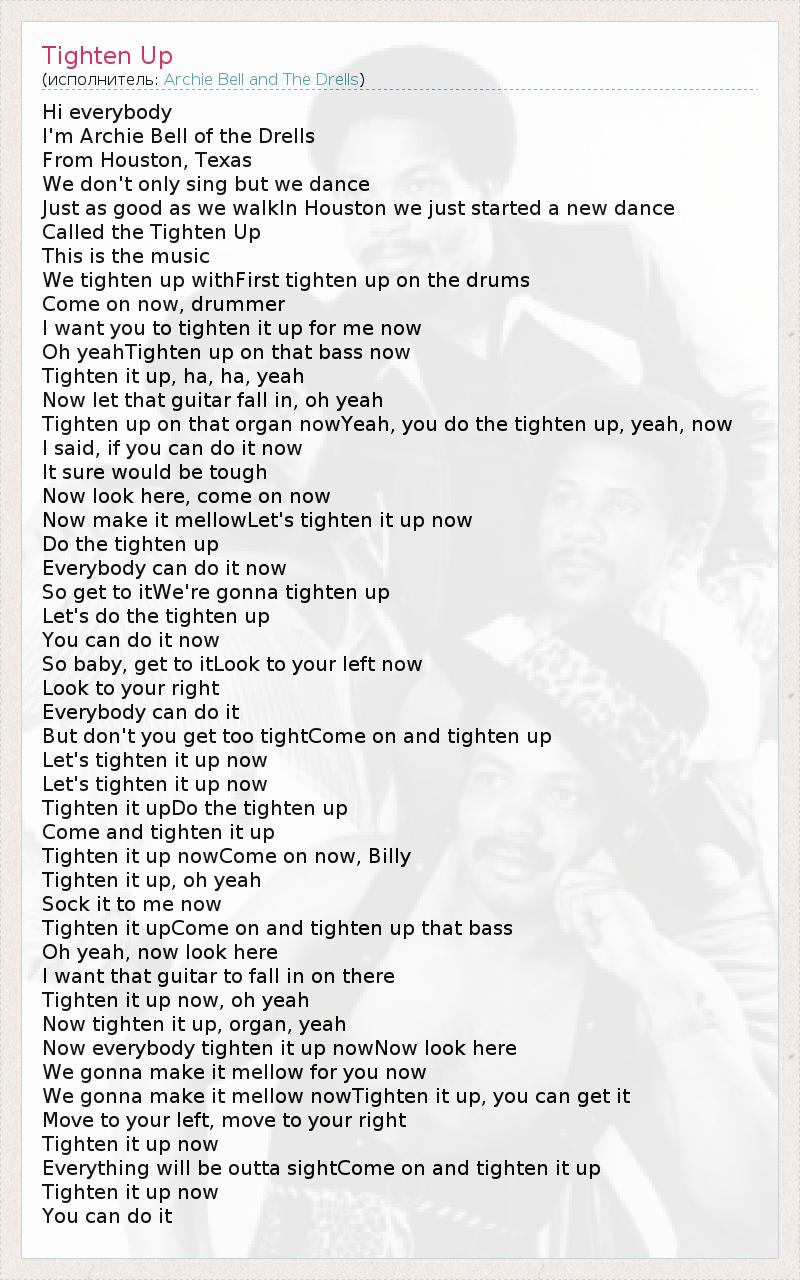 Hi everybody I'm Archie Bell of the Drells From Houston, Texas We don't only sing but we dance Just as good as we walkIn Houston we just started a new dance Called the Tighten Up This is the music We tighten up withFirst tighten up on the drums Come on now, drummer I want you to tighten it up for me now Oh yeahTighten up on that bass now Tighten it up, ha, ha, yeah Now let that guitar fall in, oh yeah Tighten up on that organ nowYeah, you do the tighten up, yeah, now I said, if you can do it now It sure would be tough Now look here, come on now Now make it mellowLet's tighten it up now Do the tighten up Everybody can do it now So get to itWe're gonna tighten up Let's do the tighten up You can do it now So baby, get to itLook to your left now Look to your right Everybody can do it But don't you get too tightCome on and tighten up Let's tighten it up now Let's tighten it up now Tighten it upDo the tighten up Come and tighten it up Tighten it up nowCome on now, Billy Tighten it up, oh yeah Sock it to me now Tighten it upCome on and tighten up that bass Oh yeah, now look here I want that guitar to fall in on there Tighten it up now, oh yeah Now tighten it up, organ, yeah Now everybody tighten it up nowNow look here We gonna make it mellow for you now We gonna make it mellow nowTighten it up, you can get it Move to your left, move to your right Tighten it up now Everything will be outta sightCome on and tighten it up Tighten it up now You can do it