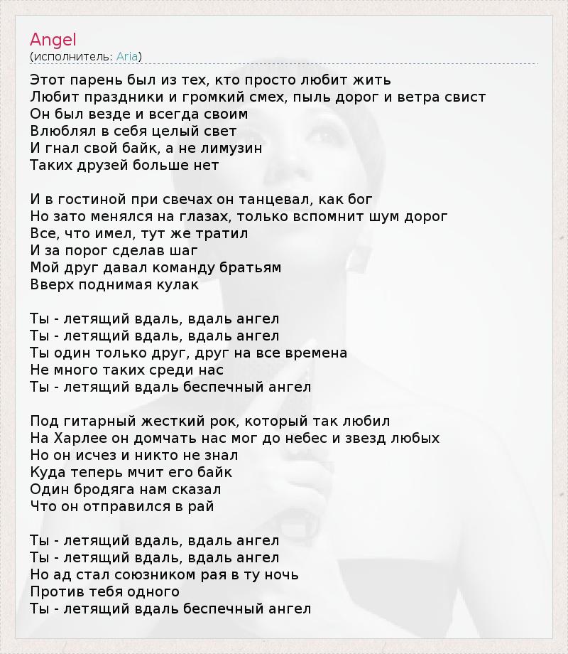 Этот парень был из тех, кто просто любит жить Любит праздники и громкий смех, пыль дорог и ветра свист Он был везде и всегда своим Влюблял в себя целый свет И гнал свой байк, а не лимузин Таких друзей больше нет И в гостиной при свечах он танцевал, как бог Но зато менялся на глазах, только вспомнит шум дорог Все, что имел, тут же тратил И за порог сделав шаг Мой друг давал команду братьям Вверх поднимая кулак Ты - летящий вдаль, вдаль ангел Ты - летящий вдаль, вдаль ангел Ты один только друг, друг на все времена Не много таких среди нас Ты - летящий вдаль беспечный ангел Под гитарный жесткий рок, который так любил На Харлее он домчать нас мог до небес и звезд любых Но он исчез и никто не знал Куда теперь мчит его байк Один бродяга нам сказал Что он отправился в рай Ты - летящий вдаль, вдаль ангел Ты - летящий вдаль, вдаль ангел Но ад стал союзником рая в ту ночь Против тебя одного Ты - летящий вдаль беспечный ангел