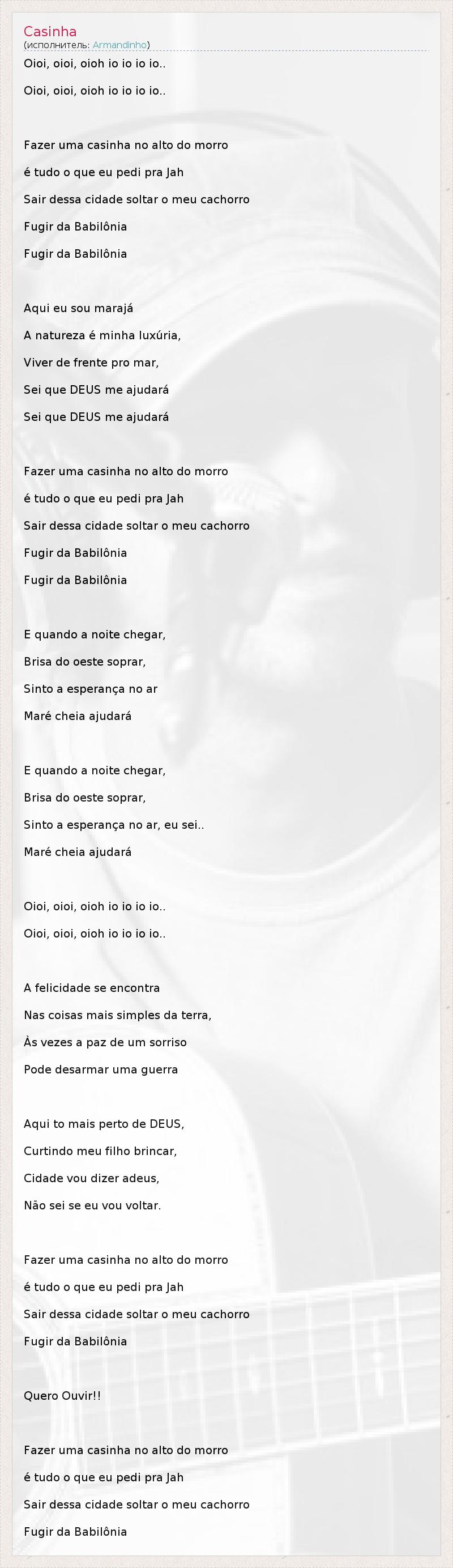 Oioi, oioi, oioh io io io io.. Oioi, oioi, oioh io io io io.. Fazer uma casinha no alto do morro é tudo o que eu pedi pra Jah Sair dessa cidade soltar o meu cachorro Fugir da Babilônia Fugir da Babilônia Aqui eu sou marajá A natureza é minha luxúria, Viver de frente pro mar, Sei que DEUS me ajudará Sei que DEUS me ajudará Fazer uma casinha no alto do morro é tudo o que eu pedi pra Jah Sair dessa cidade soltar o meu cachorro Fugir da Babilônia Fugir da Babilônia E quando a noite chegar, Brisa do oeste soprar, Sinto a esperança no ar Maré cheia ajudará E quando a noite chegar, Brisa do oeste soprar, Sinto a esperança no ar, eu sei.. Maré cheia ajudará Oioi, oioi, oioh io io io io.. Oioi, oioi, oioh io io io io.. A felicidade se encontra Nas coisas mais simples da terra, Às vezes a paz de um sorriso Pode desarmar uma guerra Aqui to mais perto de DEUS, Curtindo meu filho brincar, Cidade vou dizer adeus, Não sei se eu vou voltar. Fazer uma casinha no alto do morro é tudo o que eu pedi pra Jah Sair dessa cidade soltar o meu cachorro Fugir da Babilônia Quero Ouvir!! Fazer uma casinha no alto do morro é tudo o que eu pedi pra Jah Sair dessa cidade soltar o meu cachorro Fugir da Babilônia