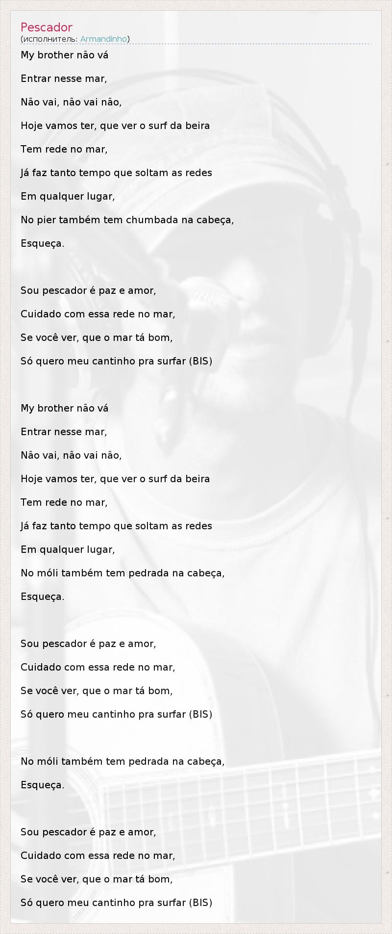 My brother não vá Entrar nesse mar, Não vai, não vai não, Hoje vamos ter, que ver o surf da beira Tem rede no mar, Já faz tanto tempo que soltam as redes Em qualquer lugar, No pier também tem chumbada na cabeça, Esqueça. Sou pescador é paz e amor, Cuidado com essa rede no mar, Se você ver, que o mar tá bom, Só quero meu cantinho pra surfar (BIS) My brother não vá Entrar nesse mar, Não vai, não vai não, Hoje vamos ter, que ver o surf da beira Tem rede no mar, Já faz tanto tempo que soltam as redes Em qualquer lugar, No móli também tem pedrada na cabeça, Esqueça. Sou pescador é paz e amor, Cuidado com essa rede no mar, Se você ver, que o mar tá bom, Só quero meu cantinho pra surfar (BIS) No móli também tem pedrada na cabeça, Esqueça. Sou pescador é paz e amor, Cuidado com essa rede no mar, Se você ver, que o mar tá bom, Só quero meu cantinho pra surfar (BIS)