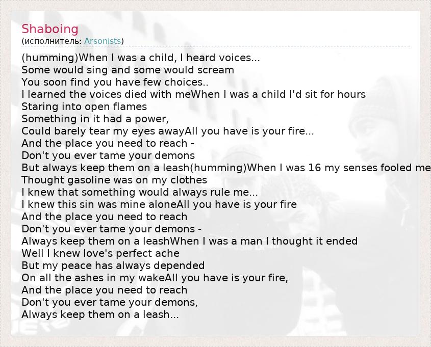(humming)When I was a child, I heard voices... Some would sing and some would scream You soon find you have few choices.. I learned the voices died with meWhen I was a child I'd sit for hours Staring into open flames Something in it had a power, Could barely tear my eyes awayAll you have is your fire... And the place you need to reach - Don't you ever tame your demons But always keep them on a leash(humming)When I was 16 my senses fooled me Thought gasoline was on my clothes I knew that something would always rule me... I knew this sin was mine aloneAll you have is your fire And the place you need to reach Don't you ever tame your demons - Always keep them on a leashWhen I was a man I thought it ended Well I knew love's perfect ache But my peace has always depended On all the ashes in my wakeAll you have is your fire, And the place you need to reach Don't you ever tame your demons, Always keep them on a leash...