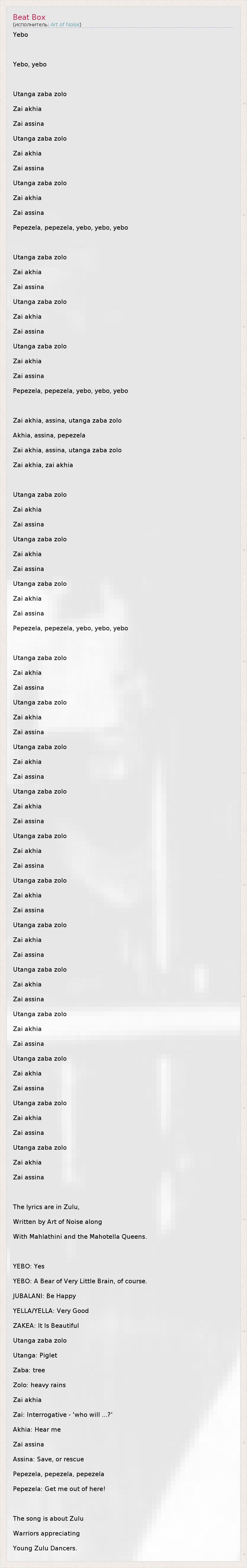 Yebo Yebo, yebo Utanga zaba zolo Zai akhia Zai assina Utanga zaba zolo Zai akhia Zai assina Utanga zaba zolo Zai akhia Zai assina Pepezela, pepezela, yebo, yebo, yebo Utanga zaba zolo Zai akhia Zai assina Utanga zaba zolo Zai akhia Zai assina Utanga zaba zolo Zai akhia Zai assina Pepezela, pepezela, yebo, yebo, yebo Zai akhia, assina, utanga zaba zolo Akhia, assina, pepezela Zai akhia, assina, utanga zaba zolo Zai akhia, zai akhia Utanga zaba zolo Zai akhia Zai assina Utanga zaba zolo Zai akhia Zai assina Utanga zaba zolo Zai akhia Zai assina Pepezela, pepezela, yebo, yebo, yebo Utanga zaba zolo Zai akhia Zai assina Utanga zaba zolo Zai akhia Zai assina Utanga zaba zolo Zai akhia Zai assina Utanga zaba zolo Zai akhia Zai assina Utanga zaba zolo Zai akhia Zai assina Utanga zaba zolo Zai akhia Zai assina Utanga zaba zolo Zai akhia Zai assina Utanga zaba zolo Zai akhia Zai assina Utanga zaba zolo Zai akhia Zai assina Utanga zaba zolo Zai akhia Zai assina Utanga zaba zolo Zai akhia Zai assina Utanga zaba zolo Zai akhia Zai assina The lyrics are in Zulu, Written by Art of Noise along With Mahlathini and the Mahotella Queens. YEBO: Yes YEBO: A Bear of Very Little Brain, of course. JUBALANI: Be Happy YELLA/YELLA: Very Good ZAKEA: It Is Beautiful Utanga zaba zolo Utanga: Piglet Zaba: tree Zolo: heavy rains Zai akhia Zai: Interrogative - 'who will ...?' Akhia: Hear me Zai assina Assina: Save, or rescue Pepezela, pepezela, pepezela Pepezela: Get me out of here! The song is about Zulu Warriors appreciating Young Zulu Dancers.
