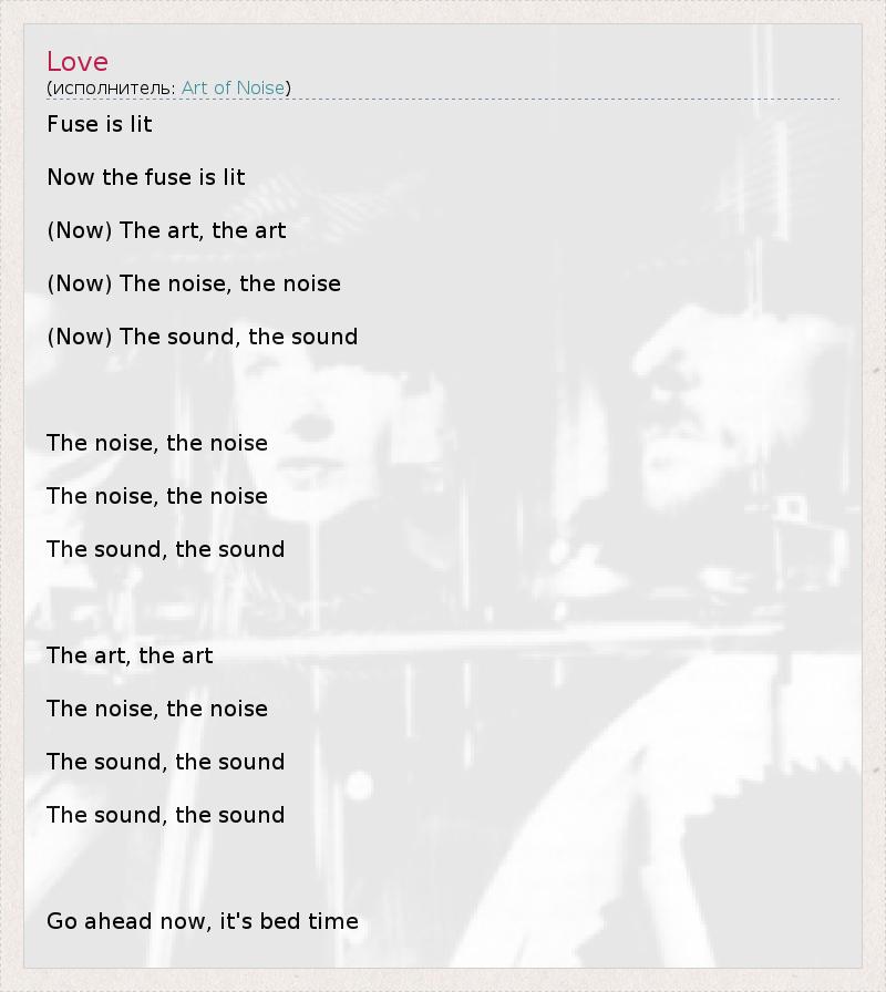 Fuse is lit Now the fuse is lit (Now) The art, the art (Now) The noise, the noise (Now) The sound, the sound The noise, the noise The noise, the noise The sound, the sound The art, the art The noise, the noise The sound, the sound The sound, the sound Go ahead now, it's bed time