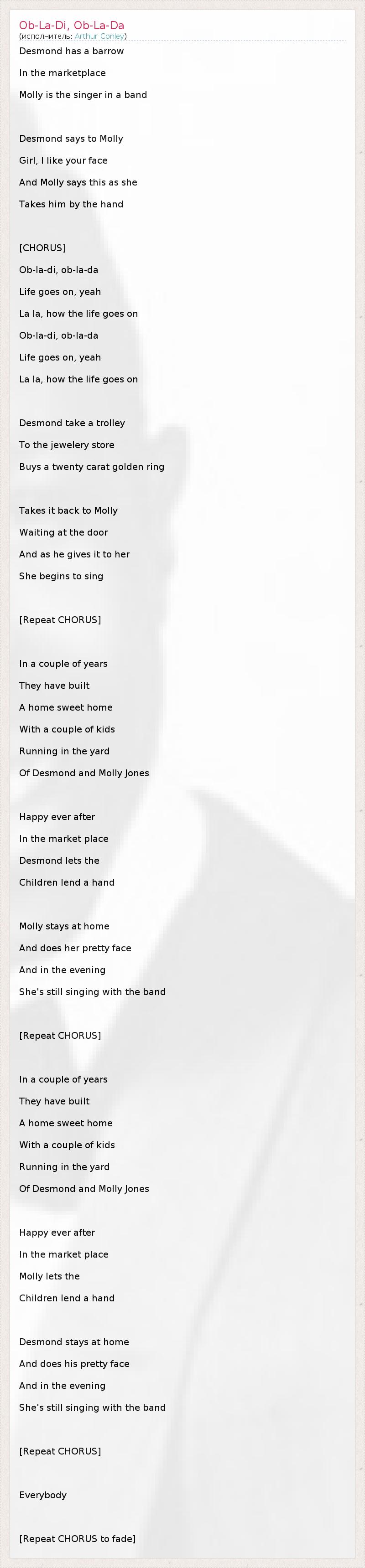 Desmond has a barrow In the marketplace Molly is the singer in a band Desmond says to Molly Girl, I like your face And Molly says this as she Takes him by the hand [CHORUS] Ob-la-di, ob-la-da Life goes on, yeah La la, how the life goes on Ob-la-di, ob-la-da Life goes on, yeah La la, how the life goes on Desmond take a trolley To the jewelery store Buys a twenty carat golden ring Takes it back to Molly Waiting at the door And as he gives it to her She begins to sing [Repeat CHORUS] In a couple of years They have built A home sweet home With a couple of kids Running in the yard Of Desmond and Molly Jones Happy ever after In the market place Desmond lets the Children lend a hand Molly stays at home And does her pretty face And in the evening She's still singing with the band [Repeat CHORUS] In a couple of years They have built A home sweet home With a couple of kids Running in the yard Of Desmond and Molly Jones Happy ever after In the market place Molly lets the Children lend a hand Desmond stays at home And does his pretty face And in the evening She's still singing with the band [Repeat CHORUS] Everybody [Repeat CHORUS to fade]