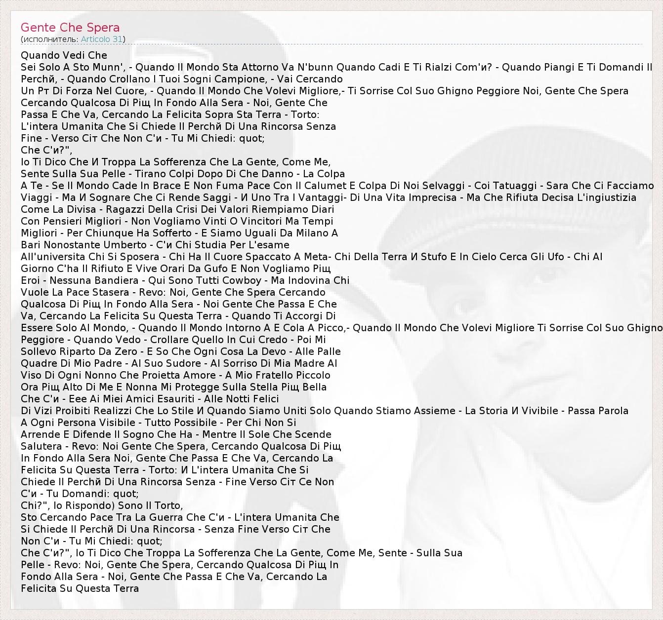 Quando Vedi Che Sei Solo A Sto Munn', - Quando Il Mondo Sta Attorno Va N'bunn Quando Cadi E Ti Rialzi Com'и? - Quando Piangi E Ti Domandi Il Perchй, - Quando Crollano I Tuoi Sogni Campione, - Vai Cercando Un Pт Di Forza Nel Cuore, - Quando Il Mondo Che Volevi Migliore,- Ti Sorrise Col Suo Ghigno Peggiore Noi, Gente Che Spera Cercando Qualcosa Di Piщ In Fondo Alla Sera - Noi, Gente Che Passa E Che Va, Cercando La Felicitа Sopra Sta Terra - Torto: L'intera Umanitа Che Si Chiede Il Perchй Di Una Rincorsa Senza Fine - Verso Ciт Che Non C'и - Tu Mi Chiedi: quot; Che C'и?", Io Ti Dico Che И Troppa La Sofferenza Che La Gente, Come Me, Sente Sulla Sua Pelle - Tirano Colpi Dopo Di Che Danno - La Colpa A Te - Se Il Mondo Cade In Brace E Non Fuma Pace Con Il Calumet E Colpa Di Noi Selvaggi - Coi Tatuaggi - Sarа Che Ci Facciamo Viaggi - Ma И Sognare Che Ci Rende Saggi - И Uno Tra I Vantaggi- Di Una Vita Imprecisa - Ma Che Rifiuta Decisa L'ingiustizia Come La Divisa - Ragazzi Della Crisi Dei Valori Riempiamo Diari Con Pensieri Migliori - Non Vogliamo Vinti O Vincitori Ma Tempi Migliori - Per Chiunque Ha Sofferto - E Siamo Uguali Da Milano A Bari Nonostante Umberto - C'и Chi Studia Per L'esame All'universitа Chi Si Sposerа - Chi Ha Il Cuore Spaccato A Metа- Chi Della Terra И Stufo E In Cielo Cerca Gli Ufo - Chi Al Giorno C'ha Il Rifiuto E Vive Orari Da Gufo E Non Vogliamo Piщ Eroi - Nessuna Bandiera - Qui Sono Tutti Cowboy - Ma Indovina Chi Vuole La Pace Stasera - Revo: Noi, Gente Che Spera Cercando Qualcosa Di Piщ In Fondo Alla Sera - Noi Gente Che Passa E Che Va, Cercando La Felicitа Su Questa Terra - Quando Ti Accorgi Di Essere Solo Al Mondo, - Quando Il Mondo Intorno A E Cola A Picco,- Quando Il Mondo Che Volevi Migliore Ti Sorrise Col Suo Ghigno Peggiore - Quando Vedo - Crollare Quello In Cui Credo - Poi Mi Sollevo Riparto Da Zero - E So Che Ogni Cosa La Devo - Alle Palle Quadre Di Mio Padre - Al Suo Sudore - Al Sorriso Di Mia Madre Al Viso Di Ogni Nonno Che Proietta Amore - A Mio Fratello Piccolo Ora Piщ Alto Di Me E Nonna Mi Protegge Sulla Stella Piщ Bella Che C'и - Eee Ai Miei Amici Esauriti - Alle Notti Felici Di Vizi Proibiti Realizzi Che Lo Stile И Quando Siamo Uniti Solo Quando Stiamo Assieme - La Storia И Vivibile - Passa Parola A Ogni Persona Visibile - Tutto Possibile - Per Chi Non Si Arrende E Difende Il Sogno Che Ha - Mentre Il Sole Che Scende Saluterа - Revo: Noi Gente Che Spera, Cercando Qualcosa Di Piщ In Fondo Alla Sera Noi, Gente Che Passa E Che Va, Cercando La Felicitа Su Questa Terra - Torto: И L'intera Umanitа Che Si Chiede Il Perchй Di Una Rincorsa Senza - Fine Verso Ciт Ce Non C'и - Tu Domandi: quot; Chi?", Io Rispondo) Sono Il Torto, Sto Cercando Pace Tra La Guerra Che C'и - L'intera Umanitа Che Si Chiede Il Perchй Di Una Rincorsa - Senza Fine Verso Ciт Che Non C'и - Tu Mi Chiedi: quot; Che C'и?", Io Ti Dico Che Troppa La Sofferenza Che La Gente, Come Me, Sente - Sulla Sua Pelle - Revo: Noi, Gente Che Spera, Cercando Qualcosa Di Piщ In Fondo Alla Sera - Noi, Gente Che Passa E Che Va, Cercando La Felicitа Su Questa Terra