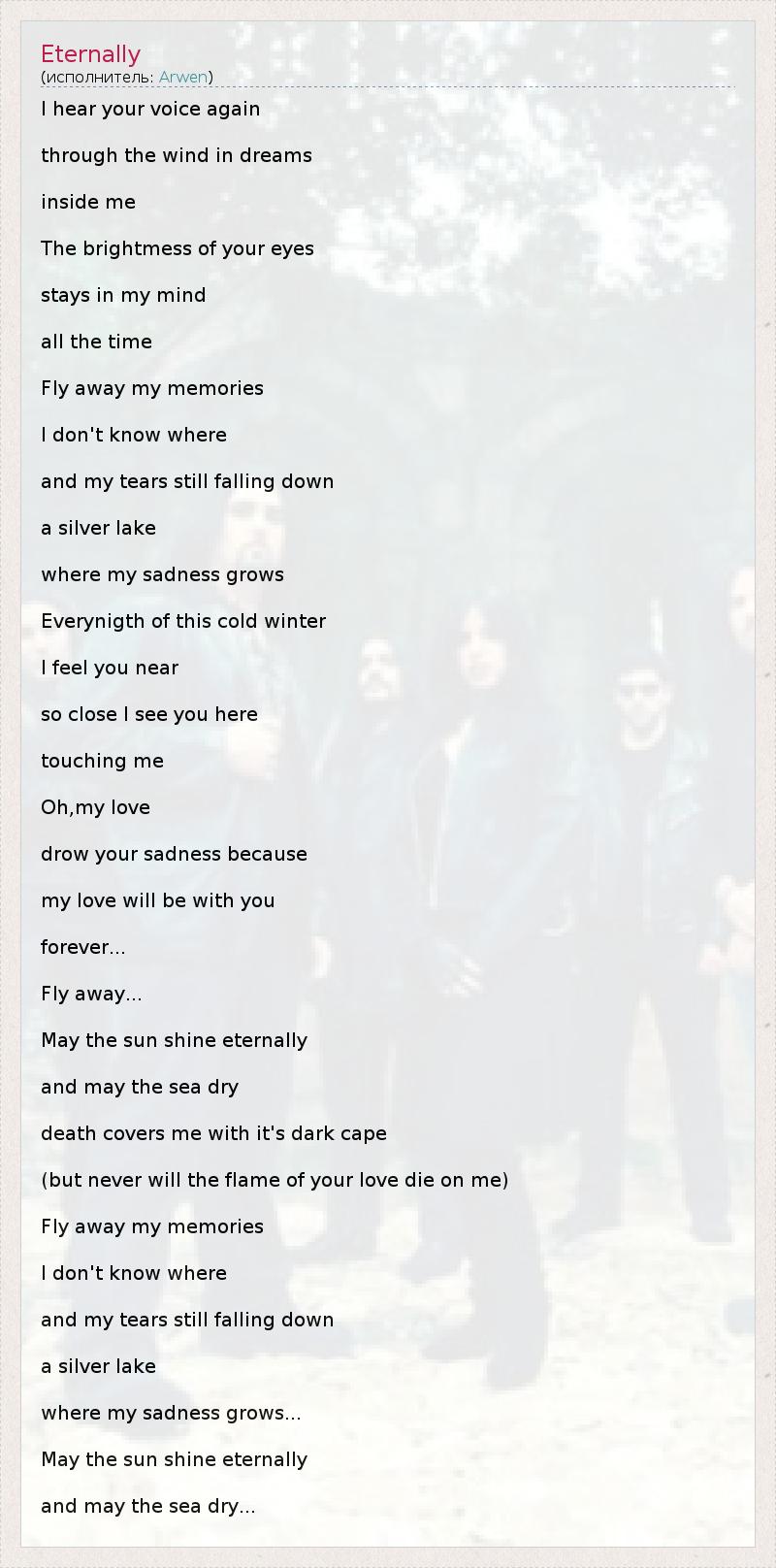 I hear your voice again through the wind in dreams inside me The brightmess of your eyes stays in my mind all the time Fly away my memories I don't know where and my tears still falling down a silver lake where my sadness grows Everynigth of this cold winter I feel you near so close I see you here touching me Oh,my love drow your sadness because my love will be with you forever... Fly away... May the sun shine eternally and may the sea dry death covers me with it's dark cape (but never will the flame of your love die on me) Fly away my memories I don't know where and my tears still falling down a silver lake where my sadness grows... May the sun shine eternally and may the sea dry...