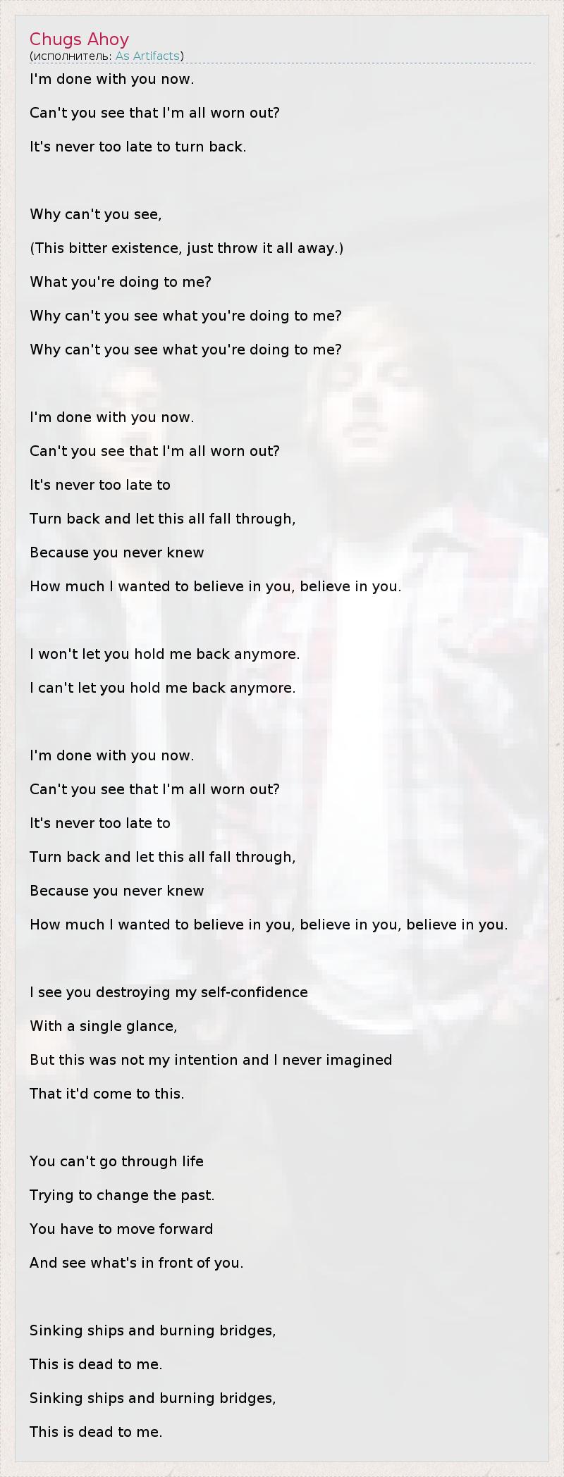 I'm done with you now. Can't you see that I'm all worn out? It's never too late to turn back. Why can't you see, (This bitter existence, just throw it all away.) What you're doing to me? Why can't you see what you're doing to me? Why can't you see what you're doing to me? I'm done with you now. Can't you see that I'm all worn out? It's never too late to Turn back and let this all fall through, Because you never knew How much I wanted to believe in you, believe in you. I won't let you hold me back anymore. I can't let you hold me back anymore. I'm done with you now. Can't you see that I'm all worn out? It's never too late to Turn back and let this all fall through, Because you never knew How much I wanted to believe in you, believe in you, believe in you. I see you destroying my self-confidence With a single glance, But this was not my intention and I never imagined That it'd come to this. You can't go through life Trying to change the past. You have to move forward And see what's in front of you. Sinking ships and burning bridges, This is dead to me. Sinking ships and burning bridges, This is dead to me.
