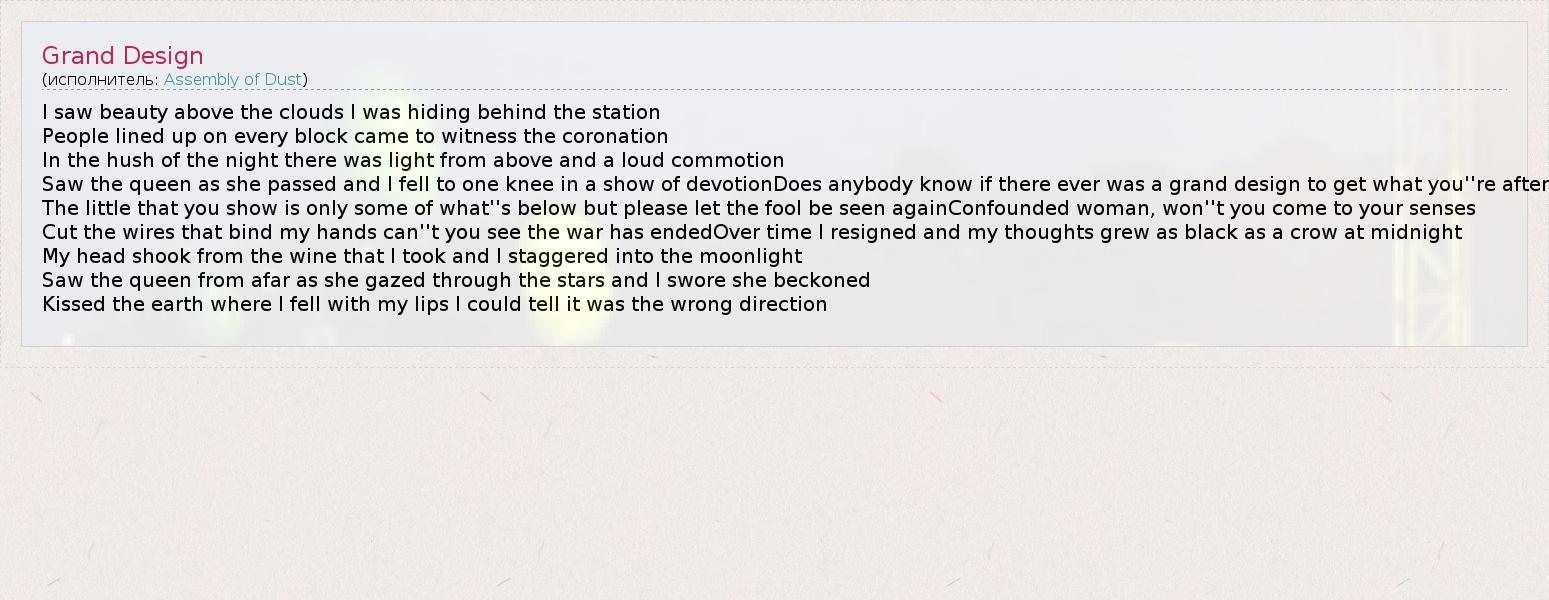 Saw the queen as she passed and I fell to one knee in a show of devotionDoes anybody know if there ever was a grand design to get what you''re after