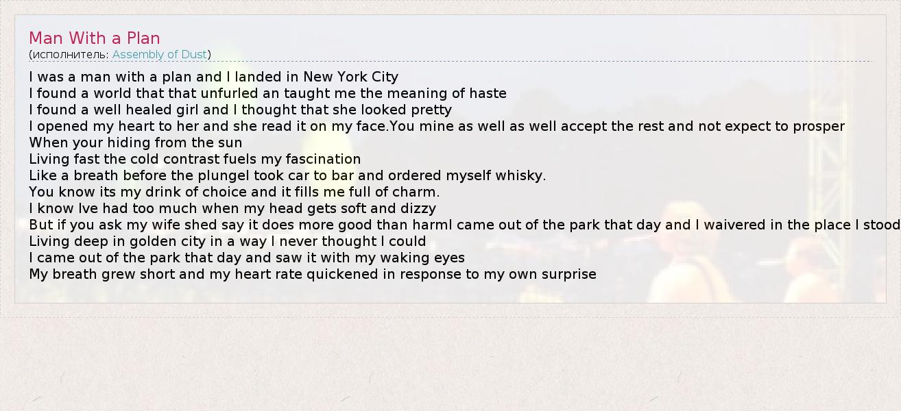 I was a man with a plan and I landed in New York City I found a world that that unfurled an taught me the meaning of haste I found a well healed girl and I thought that she looked pretty I opened my heart to her and she read it on my face.You mine as well as well accept the rest and not expect to prosper When your hiding from the sun Living fast the cold contrast fuels my fascination Like a breath before the plungeI took car to bar and ordered myself whisky. You know its my drink of choice and it fills me full of charm. I know Ive had too much when my head gets soft and dizzy But if you ask my wife shed say it does more good than harmI came out of the park that day and I waivered in the place I stood Living deep in golden city in a way I never thought I could I came out of the park that day and saw it with my waking eyes My breath grew short and my heart rate quickened in response to my own surprise