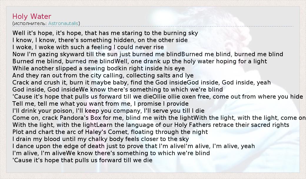 Well it's hope, it's hope, that has me staring to the burning sky I know, I know, there's something hidden, on the other side I woke, I woke with such a feeling I could never rise Now I'm gazing skyward till the sun just burned me blindBurned me blind, burned me blind Burned me blind, burned me blindWell, one drank up the holy water hoping for a light While another slipped a sewing bodkin right inside his eye And they ran out from the city calling, collecting salts and lye Crack and crush it, burn it maybe baby, find the God insideGod inside, God inside, yeah God inside, God insideWe know there's something to which we're blind 'Cause it's hope that pulls us forward till we dieOllie ollie oxen free, come out from where you hide Tell me, tell me what you want from me, I promise I provide I'll drink your poison, I'll keep you company, I'll serve you till I die Come on, crack Pandora's Box for me, blind me with the lightWith the light, with the light, come on With the light, with the lightLearn the language of our Holy Fathers retrace their sacred rights Plot and chart the arc of Haley's Comet, floating through the night I drain my blood until my chalky body feels closer to the sky I dance upon the edge of death just to prove that I'm aliveI'm alive, I'm alive, yeah I'm alive, I'm aliveWe know there's something to which we're blind 'Cause it's hope that pulls us forward till we die