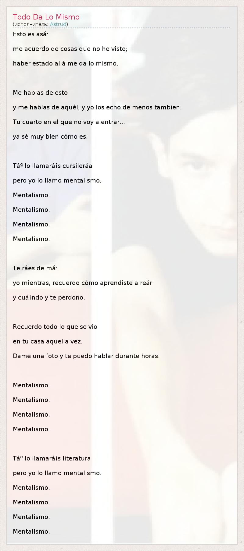 Esto es asá: me acuerdo de cosas que no he visto; haber estado allá me da lo mismo. Me hablas de esto y me hablas de aquél, y yo los echo de menos tambien. Tu cuarto en el que no voy a entrar... ya sé muy bien cómo es. TẠlo llamará¡s cursileráa pero yo lo llamo mentalismo. Mentalismo. Mentalismo. Mentalismo. Mentalismo. Te ráes de má: yo mientras, recuerdo cómo aprendiste a reár y cuá¡ndo y te perdono. Recuerdo todo lo que se vio en tu casa aquella vez. Dame una foto y te puedo hablar durante horas. Mentalismo. Mentalismo. Mentalismo. Mentalismo. TẠlo llamará¡s literatura pero yo lo llamo mentalismo. Mentalismo. Mentalismo. Mentalismo. Mentalismo.
