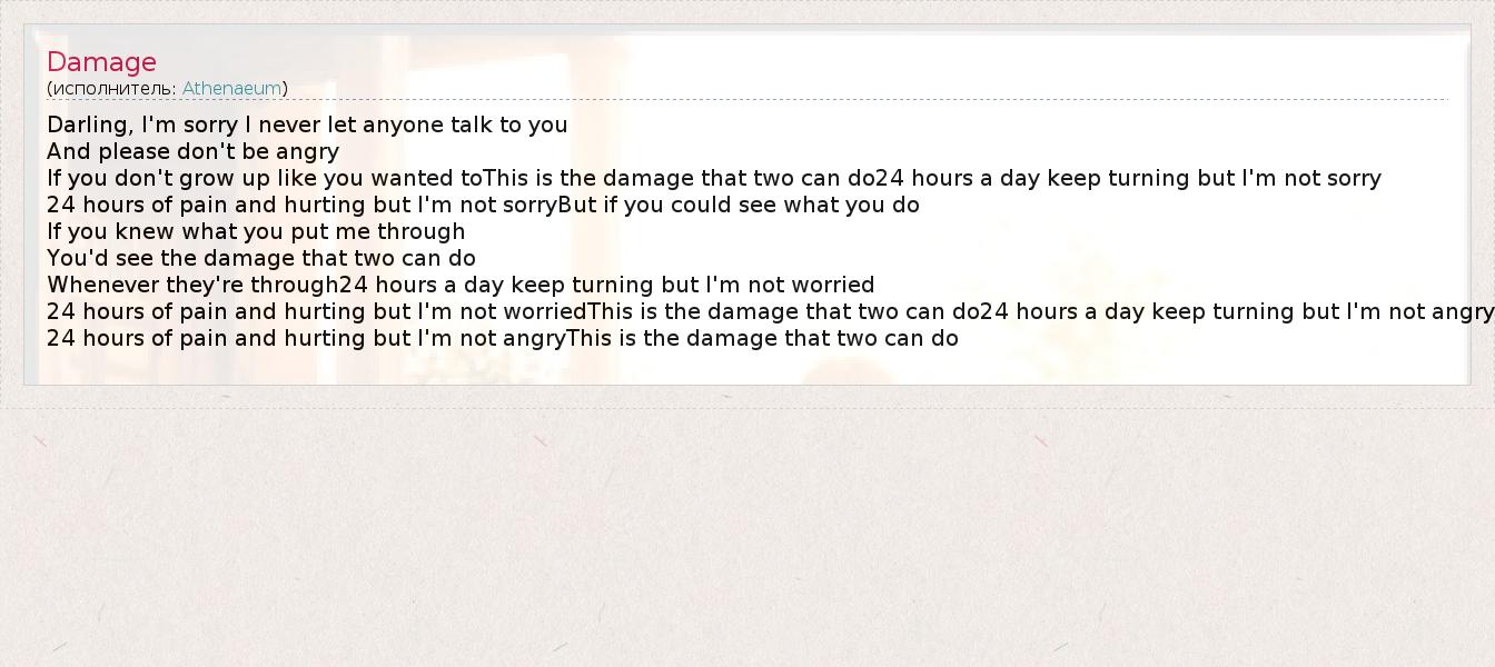 Darling, I'm sorry I never let anyone talk to you And please don't be angry If you don't grow up like you wanted toThis is the damage that two can do24 hours a day keep turning but I'm not sorry 24 hours of pain and hurting but I'm not sorryBut if you could see what you do If you knew what you put me through You'd see the damage that two can do Whenever they're through24 hours a day keep turning but I'm not worried 24 hours of pain and hurting but I'm not worriedThis is the damage that two can do24 hours a day keep turning but I'm not angry 24 hours of pain and hurting but I'm not angryThis is the damage that two can do