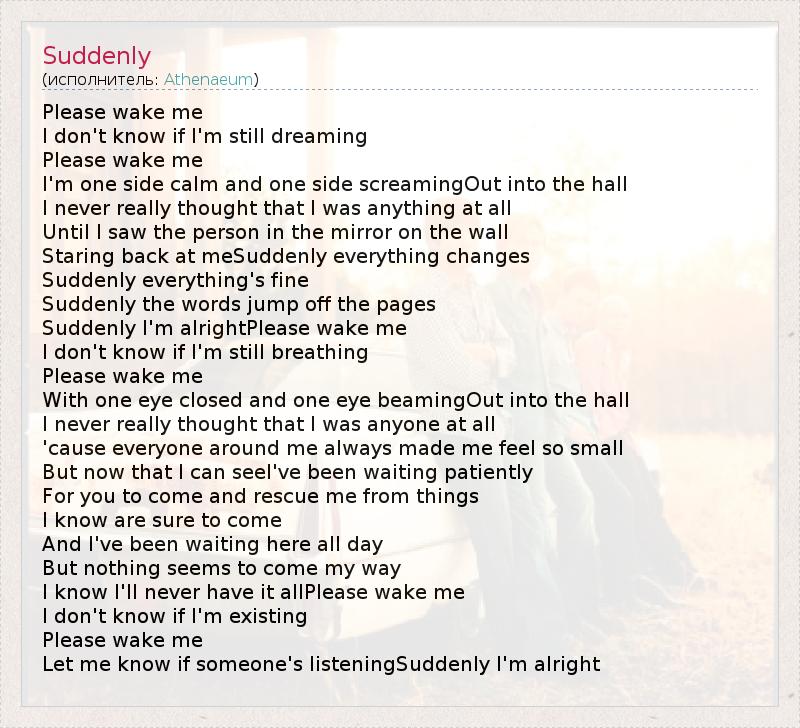 Please wake me I don't know if I'm still dreaming Please wake me I'm one side calm and one side screamingOut into the hall I never really thought that I was anything at all Until I saw the person in the mirror on the wall Staring back at meSuddenly everything changes Suddenly everything's fine Suddenly the words jump off the pages Suddenly I'm alrightPlease wake me I don't know if I'm still breathing Please wake me With one eye closed and one eye beamingOut into the hall I never really thought that I was anyone at all 'cause everyone around me always made me feel so small But now that I can seeI've been waiting patiently For you to come and rescue me from things I know are sure to come And I've been waiting here all day But nothing seems to come my way I know I'll never have it allPlease wake me I don't know if I'm existing Please wake me Let me know if someone's listeningSuddenly I'm alright