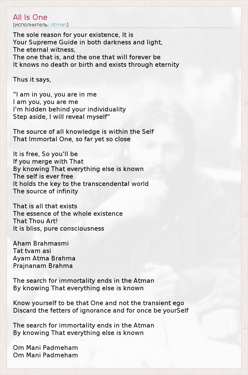 The sole reason for your existence, It is Your Supreme Guide in both darkness and light, The eternal witness, The one that is, and the one that will forever be It knows no death or birth and exists through eternity Thus it says, "I am in you, you are in me I am you, you are me I'm hidden behind your individuality Step aside, I will reveal myself" The source of all knowledge is within the Self That Immortal One, so far yet so close It is free, So you'll be If you merge with That By knowing That everything else is known The self is ever free It holds the key to the transcendental world The source of infinity That is all that exists The essence of the whole existence That Thou Art! It is bliss, pure consciousness Aham Brahmasmi Tat tvam asi Ayam Atma Brahma Prajnanam Brahma The search for immortality ends in the Atman By knowing That everything else is known Know yourself to be that One and not the transient ego Discard the fetters of ignorance and for once be yourSelf The search for immortality ends in the Atman By knowing That everything else is known Om Mani Padmeham Om Mani Padmeham