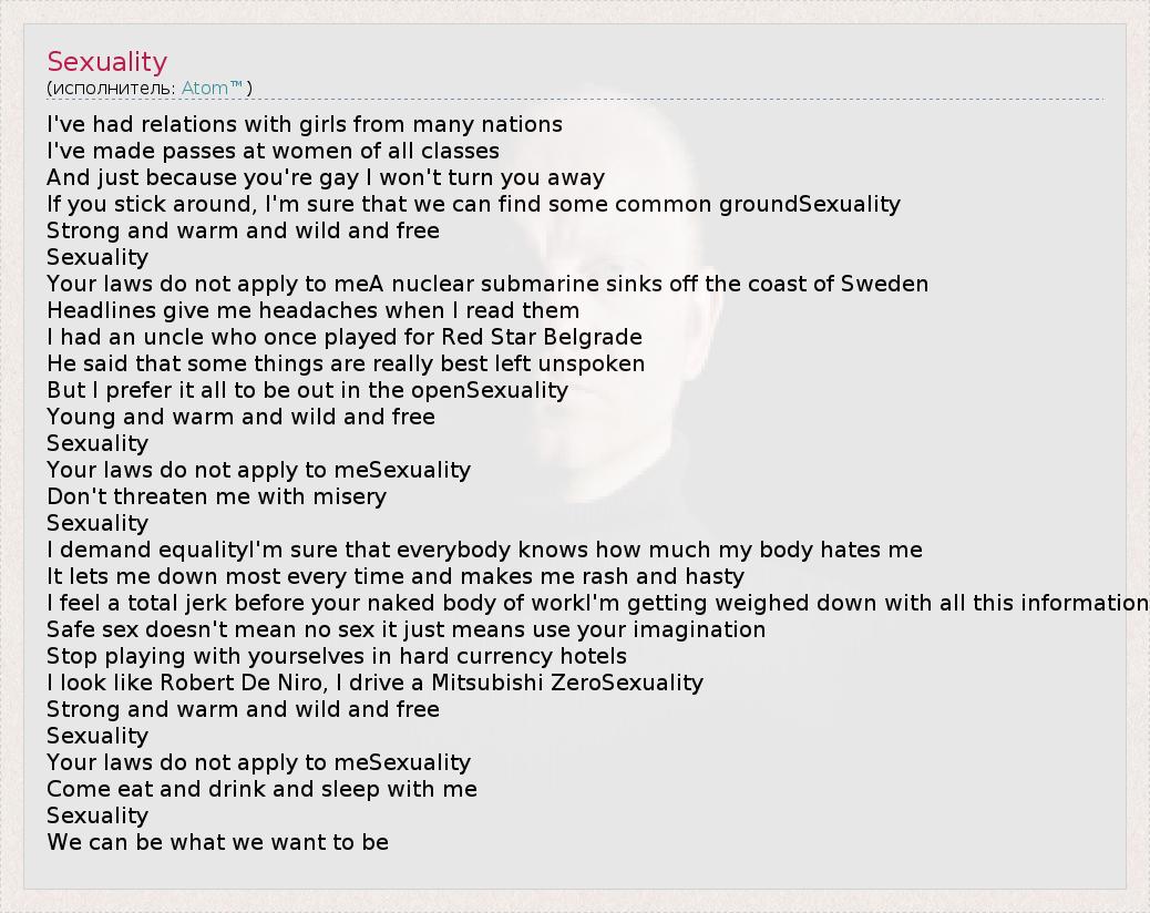 I've had relations with girls from many nations I've made passes at women of all classes And just because you're gay I won't turn you away If you stick around, I'm sure that we can find some common groundSexuality Strong and warm and wild and free Sexuality Your laws do not apply to meA nuclear submarine sinks off the coast of Sweden Headlines give me headaches when I read them I had an uncle who once played for Red Star Belgrade He said that some things are really best left unspoken But I prefer it all to be out in the openSexuality Young and warm and wild and free Sexuality Your laws do not apply to meSexuality Don't threaten me with misery Sexuality I demand equalityI'm sure that everybody knows how much my body hates me It lets me down most every time and makes me rash and hasty I feel a total jerk before your naked body of workI'm getting weighed down with all this information Safe sex doesn't mean no sex it just means use your imagination Stop playing with yourselves in hard currency hotels I look like Robert De Niro, I drive a Mitsubishi ZeroSexuality Strong and warm and wild and free Sexuality Your laws do not apply to meSexuality Come eat and drink and sleep with me Sexuality We can be what we want to be