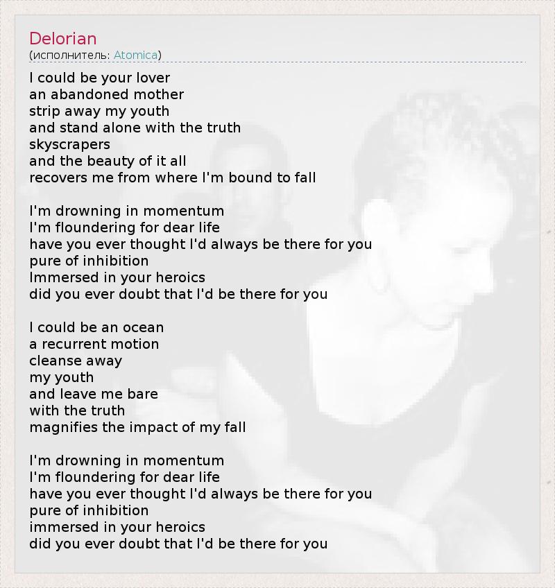 I could be your lover an abandoned mother strip away my youth and stand alone with the truth skyscrapers and the beauty of it all recovers me from where I'm bound to fall I'm drowning in momentum I'm floundering for dear life have you ever thought I'd always be there for you pure of inhibition Immersed in your heroics did you ever doubt that I'd be there for you I could be an ocean a recurrent motion cleanse away my youth and leave me bare with the truth magnifies the impact of my fall I'm drowning in momentum I'm floundering for dear life have you ever thought I'd always be there for you pure of inhibition immersed in your heroics did you ever doubt that I'd be there for you
