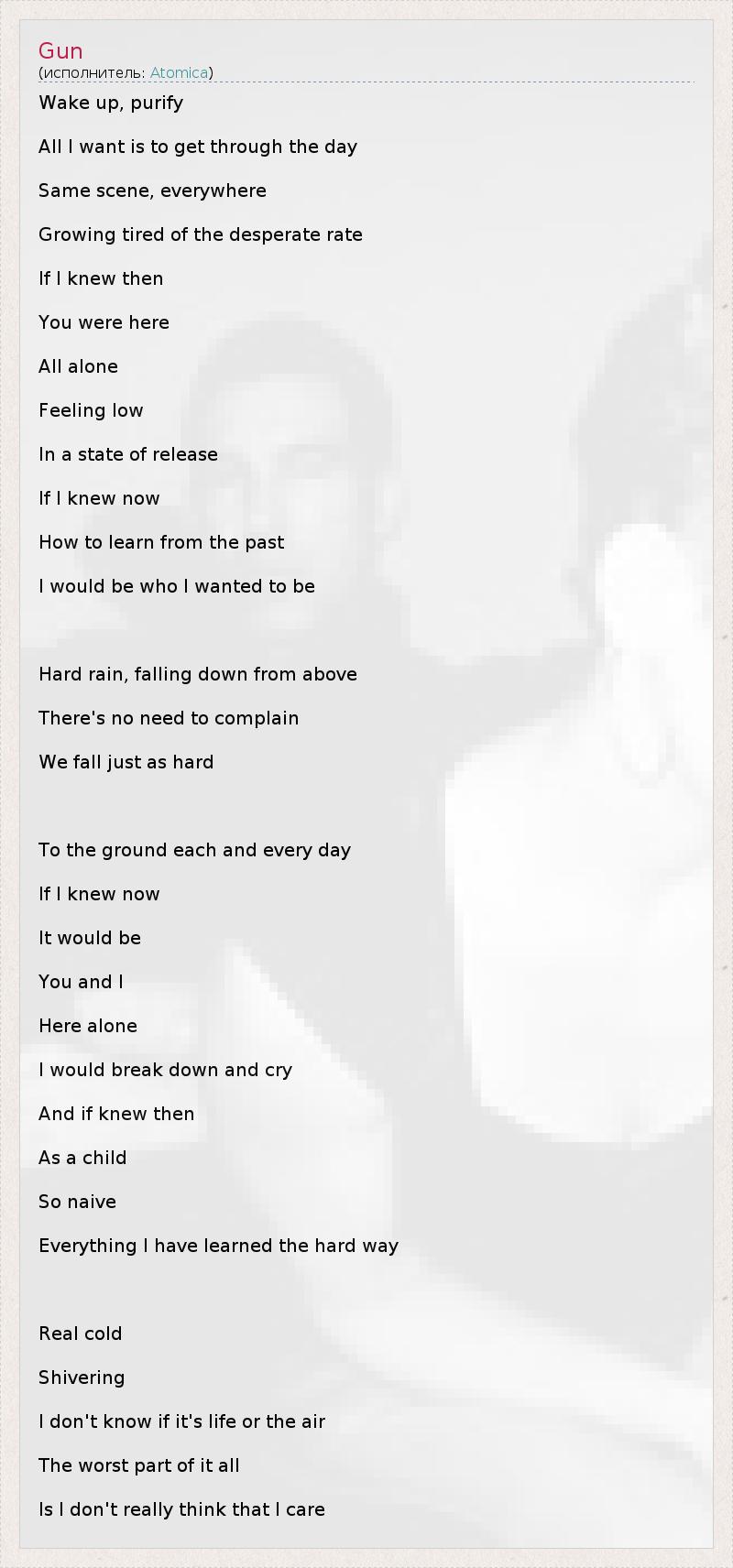 Wake up, purify All I want is to get through the day Same scene, everywhere Growing tired of the desperate rate If I knew then You were here All alone Feeling low In a state of release If I knew now How to learn from the past I would be who I wanted to be Hard rain, falling down from above There's no need to complain We fall just as hard To the ground each and every day If I knew now It would be You and I Here alone I would break down and cry And if knew then As a child So naive Everything I have learned the hard way Real cold Shivering I don't know if it's life or the air The worst part of it all Is I don't really think that I care