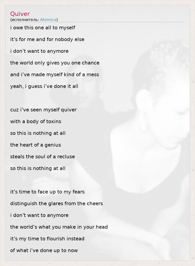 i owe this one all to myself it’s for me and for nobody else i don’t want to anymore the world only gives you one chance and i've made myself kind of a mess yeah, i guess i’ve done it all cuz i’ve seen myself quiver with a body of toxins so this is nothing at all the heart of a genius steals the soul of a recluse so this is nothing at all it’s time to face up to my fears distinguish the glares from the cheers i don’t want to anymore the world's what you make in your head it’s my time to flourish instead of what i've done up to now