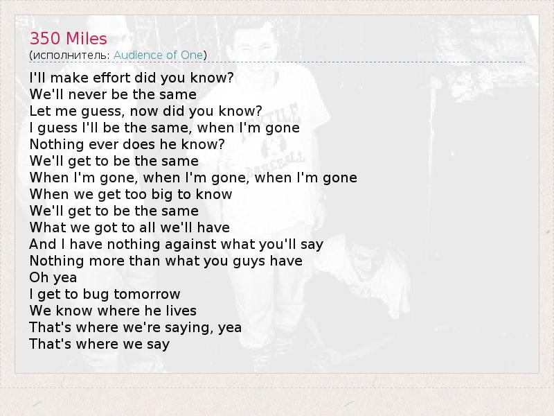Это интересно:Audience Of One - группа, существовавшая в конце девяностых годов, где играл, ещё будучи тинейджером, Энтони Грин (Anthony Green) (побывавший вокалистом Saosin в 2003 году и на данный момент - вокалист Circa Survive). Коллектив был основан в 1997 году в Дойлстаун, штат Пенсильвания. Группа выпустила их единственный альбом “I Remember When This All Meant Something” на локальном... продолжение