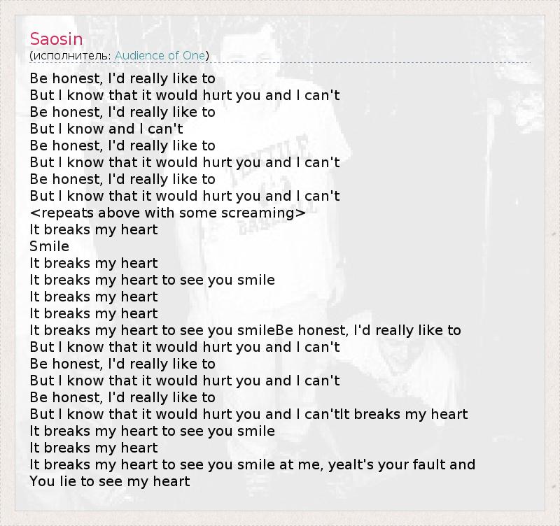 Это интересно:Audience Of One - группа, существовавшая в конце девяностых годов, где играл, ещё будучи тинейджером, Энтони Грин (Anthony Green) (побывавший вокалистом Saosin в 2003 году и на данный момент - вокалист Circa Survive). Коллектив был основан в 1997 году в Дойлстаун, штат Пенсильвания. Группа выпустила их единственный альбом “I Remember When This All Meant Something” на локальном... продолжение