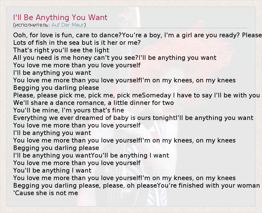 А как ты думаешь, о чем песня "I'll Be Anything You Want" ?