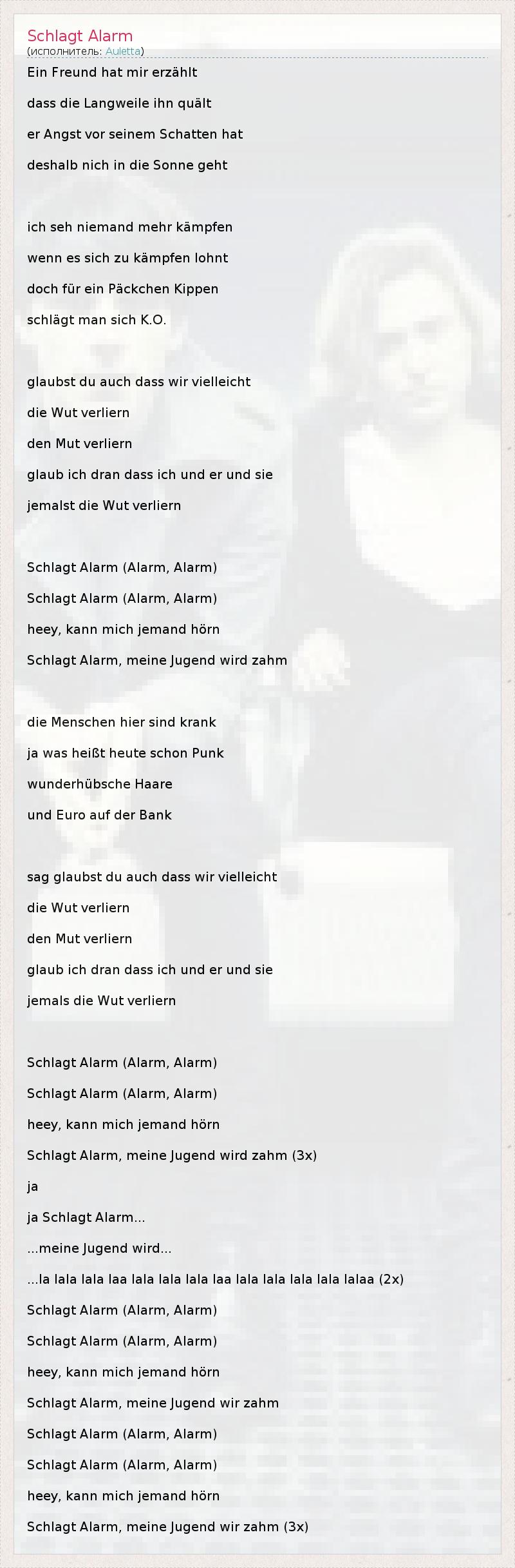 Ein Freund hat mir erzählt dass die Langweile ihn quält er Angst vor seinem Schatten hat deshalb nich in die Sonne geht ich seh niemand mehr kämpfen wenn es sich zu kämpfen lohnt doch für ein Päckchen Kippen schlägt man sich K.O. glaubst du auch dass wir vielleicht die Wut verliern den Mut verliern glaub ich dran dass ich und er und sie jemalst die Wut verliern Schlagt Alarm (Alarm, Alarm) Schlagt Alarm (Alarm, Alarm) heey, kann mich jemand hörn Schlagt Alarm, meine Jugend wird zahm die Menschen hier sind krank ja was heißt heute schon Punk wunderhübsche Haare und Euro auf der Bank sag glaubst du auch dass wir vielleicht die Wut verliern den Mut verliern glaub ich dran dass ich und er und sie jemals die Wut verliern Schlagt Alarm (Alarm, Alarm) Schlagt Alarm (Alarm, Alarm) heey, kann mich jemand hörn Schlagt Alarm, meine Jugend wird zahm (3x) ja ja Schlagt Alarm... ...meine Jugend wird... ...la lala lala laa lala lala lala laa lala lala lala lala lalaa (2x) Schlagt Alarm (Alarm, Alarm) Schlagt Alarm (Alarm, Alarm) heey, kann mich jemand hörn Schlagt Alarm, meine Jugend wir zahm Schlagt Alarm (Alarm, Alarm) Schlagt Alarm (Alarm, Alarm) heey, kann mich jemand hörn Schlagt Alarm, meine Jugend wir zahm (3x)