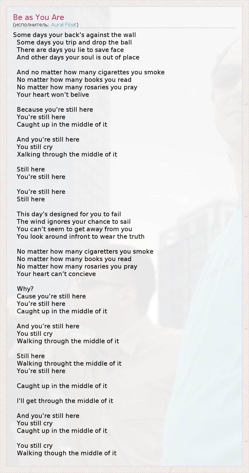Some days your back's against the wall Some days you trip and drop the ball There are days you lie to save face And other days your soul is out of place And no matter how many cigarettes you smoke No matter how many books you read No matter how many rosaries you pray Your heart won't belive Because you're still here You're still here Caught up in the middle of it And you're still here You still cry Xalking through the middle of it Still here You're still here You're still here Still here This day's designed for you to fail The wind ignores your chance to sail You can't seem to get away from you You look around infront to wear the truth No matter how many cigaretters you smoke No matter how many books you read No matter how many rosaries you pray Your heart can't concieve Why? Cause you're still here You're still here Caught up in the middle of it And you're still here You still cry Walking through the middle of it Still here Walking throught the middle of it You're still here Caught up in the middle of it I'll get through the middle of it And you're still here You still cry Caught up in the middle of it You still cry Walking though the middle of it
