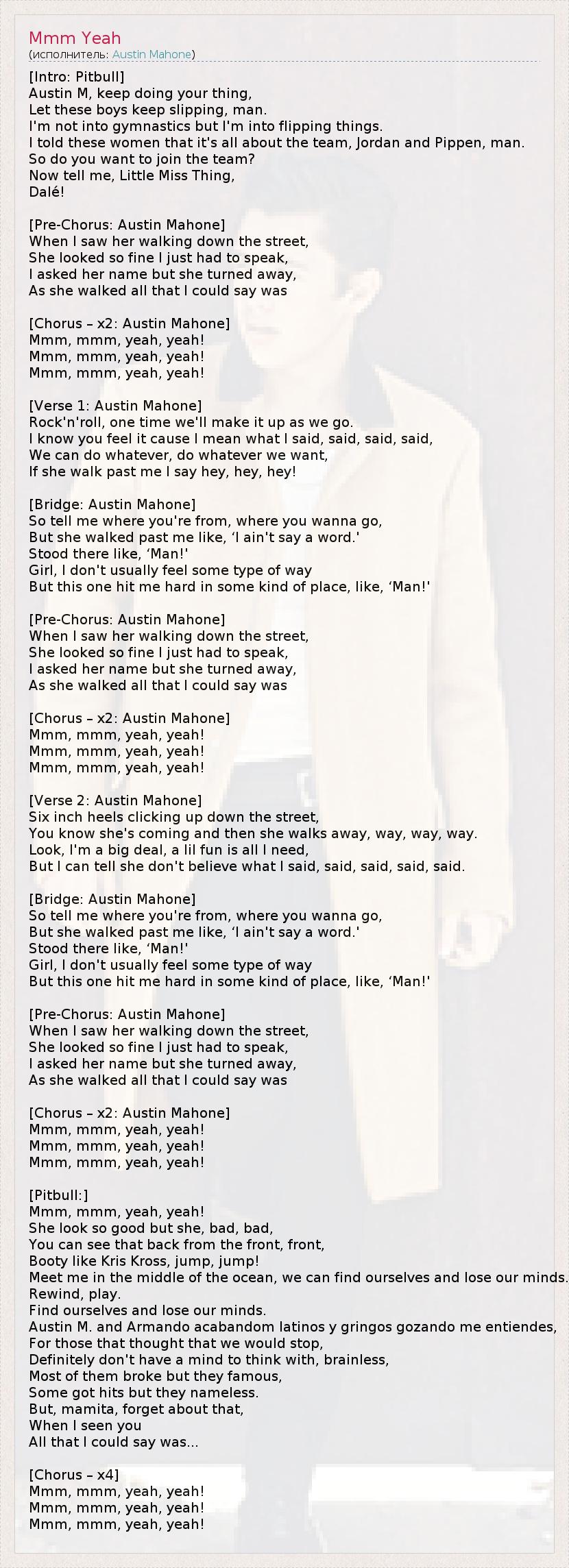 [Вступление: Pitbull] Остин М, продолжай в том же духе, Пусть другие пацаны и дальше промахиваются, чел. Я не очень люблю гимнастику, но очень люблю кувыркаться. Я сказал дамочкам, что всё ради команды, Пиппен и Джордан, чувак. 1 Вы хотите присоединиться? Скажи мне, Маленькая Мисс Штучка, Погнали! [Распевка: Austin Mahone] Когда я увидел, как она идёт по улице, Такая красивая, что мне пришлось нарушить молчание, Я спросил, как её зовут, но она развернулась, И когда она уходила, у меня не было слов кроме [Припев – х2: Austin Mahone] М-м-м, м-м-м, да, да! М-м-м, м-м-м, да, да! М-м-м, м-м-м, да, да! [Куплет 1: Austin Mahone] Рок-н-ролл, у нас всё получится, если ты пойдёшь со мной, Я знаю, ты этого хочешь, потому что я отвечаю за слова, слова, слова, Мы можем делать что угодно, делать что угодно, Когда она проходит мимо, я кричу: "Эй-эй-эй!" [Связка: Austin Mahone] Скажи мне, откуда ты, куда хочешь пойти, Но она прошла мимо, так и не сказав ни слова, А я стою и такой "блин!" Детка, я обычно так не заморачиваюсь, Но, послушай, в этот раз меня очень задело, я такой "блин!" [Распевка: Austin Mahone] Когда я увидел, как она идёт по улице, Такая красивая, что мне пришлось нарушить молчание, Я спросил, как её зовут, но она развернулась, И когда она уходила, у меня не было слов кроме [Припев – х2: Austin Mahone] М-м-м, м-м-м, да, да! М-м-м, м-м-м, да, да! М-м-м, м-м-м, да, да! [Куплет 2: Austin Mahone] Пятнадцатисантиметровые каблуки цокают по улице, Ты понимаешь, что она приближается, а потом уходит, уходит, уходит. Короче, я серьёзный парень, но всё, что мне нужно – немножко веселья, Но я вижу, что она не верит моим словам, словам, словам, словам. [Связка: Austin Mahone] Скажи мне, откуда ты, куда хочешь пойти, Но она прошла мимо, так и не сказав ни слова, А я стою и такой "блин!" Детка, я обычно так не заморачиваюсь, Но, послушай, в этот раз меня очень задело, я такой "блин!" [Распевка: Austin Mahone] Когда я увидел, как она идёт по улице, Такая красивая, что мне пришлось нарушить молчание, Я спросил, как её зовут, но она развернулась, И когда она уходила, у меня не было слов кроме [Припев – х2: Austin Mahone] М-м-м, м-м-м, да, да! М-м-м, м-м-м, да, да! М-м-м, м-м-м, да, да! [Pitbull:] М-м-м, м-м-м, да, да! Она выглядит послушной, но, на самом деле, плохая, плохая, плохая, Её зад можно увидеть, даже когда она анфас, анфас, анфас, Её попка, как Крис Кросс – прыгает, прыгает! 2 Встретимся посреди океана, там мы сможем найти себя и потерять рассудок. Перемотка, воспроизведение. Найти себя и потерять рассудок. Остин М. и Армандо закончили, я знаю, латинос и гринго это понравится, 3 Для тех, кто думал, что мы остановимся: У вас, явно, нет ума, вы безмозглые, Большинство из них бедные, но знаменитые, У некоторых есть хиты, но нет славы. Но, мамита, забудь об этом, Когда я увидел тебя, То не нашёл других слов кроме... [Припев: х4] М-м-м, м-м-м, да, да! М-м-м, м-м-м, да, да! М-м-м, м-м-м, да, да! 1 – Майкл Джеффри Джордан – выдающийся американский баскетболист, бывший игрок клуба НБА "Чикаго Буллз", атакующий защитник; шестикратный чемпион НБА, двукратный Олимпийский чемпион. Скотти Морис Пиппен – знаменитый американский баскетболист, лёгкий форвард; шестикратный чемпион НБА в составе "Чикаго Буллз", двукратный олимпийский чемпион в составе сборной США. 2 – Kris Kross – американский хип-хоп дуэт, прославившийся вышедшей в 1992 году песне "Jump". 3 – Армандо Кристиан Перез – настоящее имя Pitbull. Гринго – в Латинской Америке презрительное название неиспаноязычного (либо 