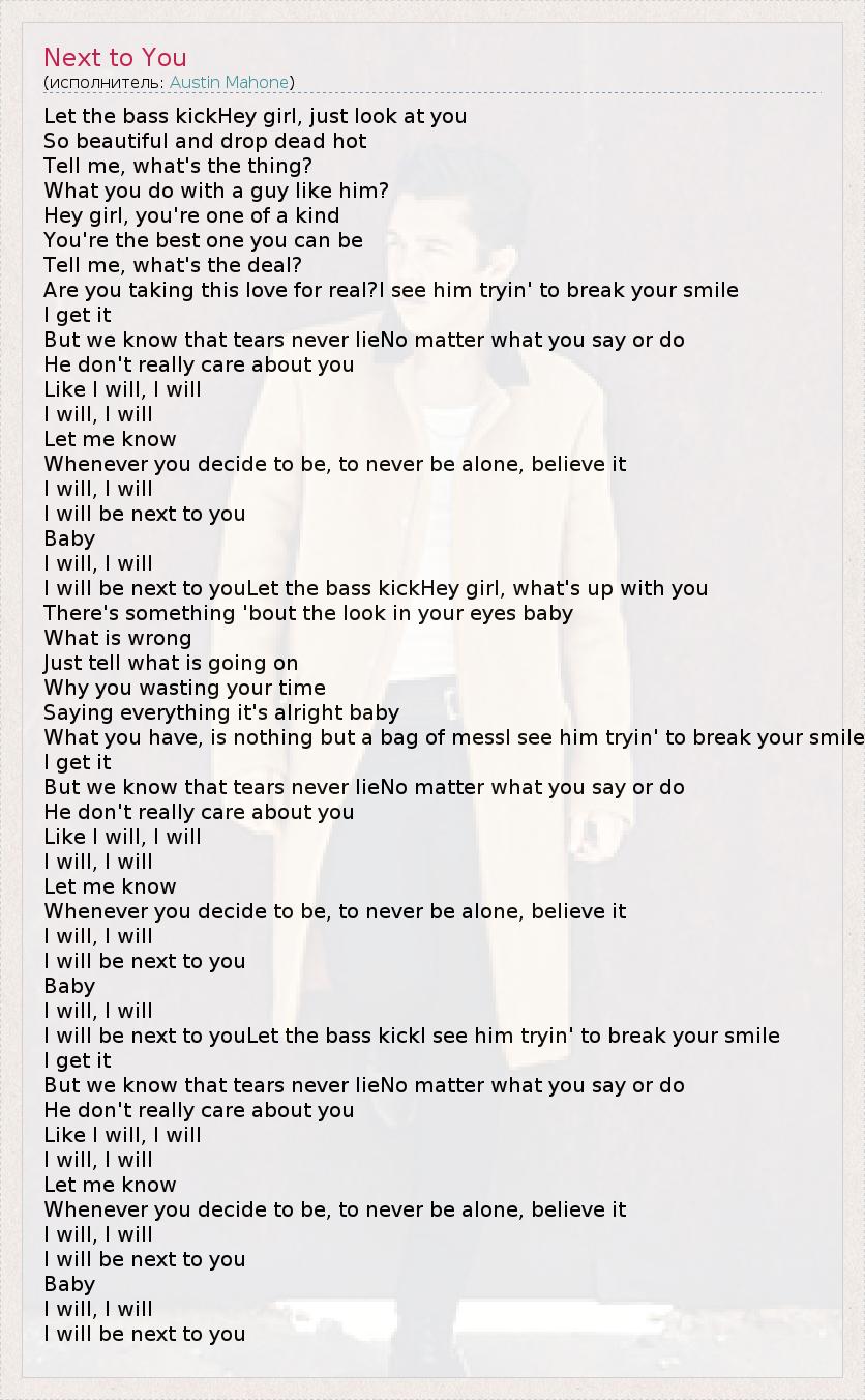 Let the bass kickHey girl, just look at you So beautiful and drop dead hot Tell me, what's the thing? What you do with a guy like him? Hey girl, you're one of a kind You're the best one you can be Tell me, what's the deal? Are you taking this love for real?I see him tryin' to break your smile I get it But we know that tears never lieNo matter what you say or do He don't really care about you Like I will, I will I will, I will Let me know Whenever you decide to be, to never be alone, believe it I will, I will I will be next to you Baby I will, I will I will be next to youLet the bass kickHey girl, what's up with you There's something 'bout the look in your eyes baby What is wrong Just tell what is going on Why you wasting your time Saying everything it's alright baby What you have, is nothing but a bag of messI see him tryin' to break your smile I get it But we know that tears never lieNo matter what you say or do He don't really care about you Like I will, I will I will, I will Let me know Whenever you decide to be, to never be alone, believe it I will, I will I will be next to you Baby I will, I will I will be next to youLet the bass kickI see him tryin' to break your smile I get it But we know that tears never lieNo matter what you say or do He don't really care about you Like I will, I will I will, I will Let me know Whenever you decide to be, to never be alone, believe it I will, I will I will be next to you Baby I will, I will I will be next to you