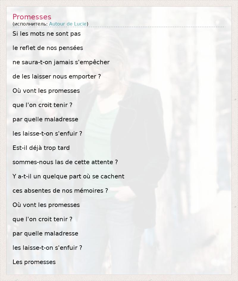 Это интересно:Autour De Lucie - французская поп-рок-группа, состоящая из вокалистки Валери Люллиот, гитариста Оливье Дуранда и басиста Фабриса Думонта . Их альбомы выпускаются во Франции на лейбле Le Village Vert, а в Северной Америке на Nettwerk. Их дебютный альбом "L'Échappée Belle был выпущен в 1993 году, но затем был переиздан на Nettwerk и Le Village Vert в 1996 году под названием Autour De Lucie с бонусом на английском языке – треком... продолжение