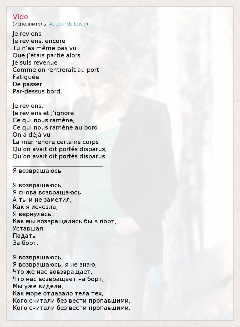 Je reviens Je reviens, encore Tu n'as même pas vu Que j'étais partie alors Je suis revenue Comme on rentrerait au port Fatiguée De passer Par-dessus bord. Je reviens, Je reviens et j'ignore Ce qui nous ramène, Ce qui nous ramène au bord On a déjà vu La mer rendre certains corps Qu'on avait dit portés disparus, Qu'on avait dit portés disparus. ______________________________ Я возвращаюсь Я возвращаюсь, Я снова возвращаюсь А ты и не заметил, Как я исчезла, Я вернулась, Как мы возвращались бы в порт, Уставшая Падать За борт. Я возвращаюсь, Я возвращаюсь, я не знаю, Что же нас вовзвращает, Что нас возвращает на борт, Мы уже видели, Как море отдавало тела тех, Кого считали без вести пропавшими, Кого считали без вести пропавшими.